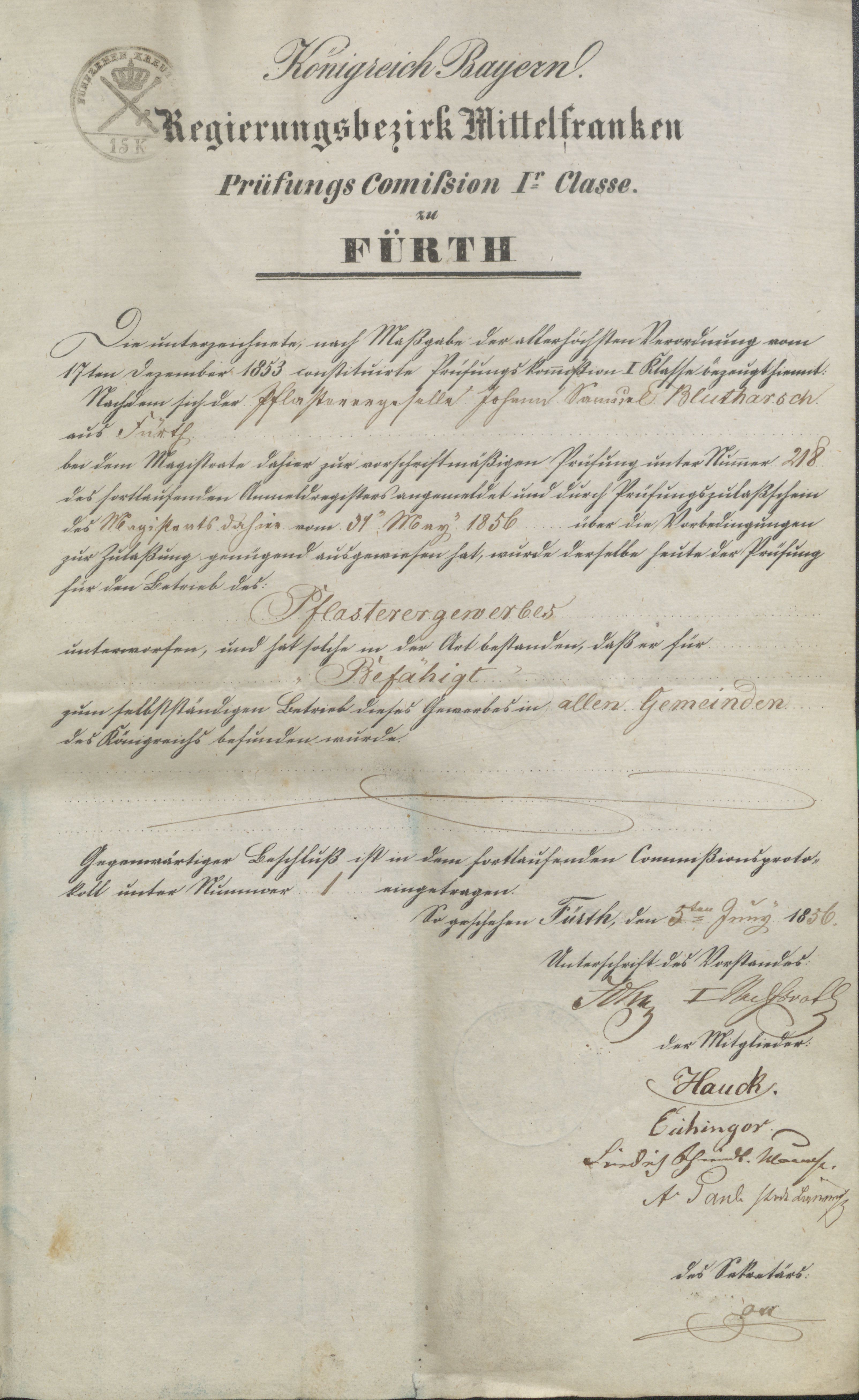 | Dateiinfo (Bild-Unterschrift und Info-Box, automatisch erstellt) | Prüfungszeugnis für Johann Blutharsch, Juni 1856 Lizenz: Bildlizenz-Stadtarchiv | ||