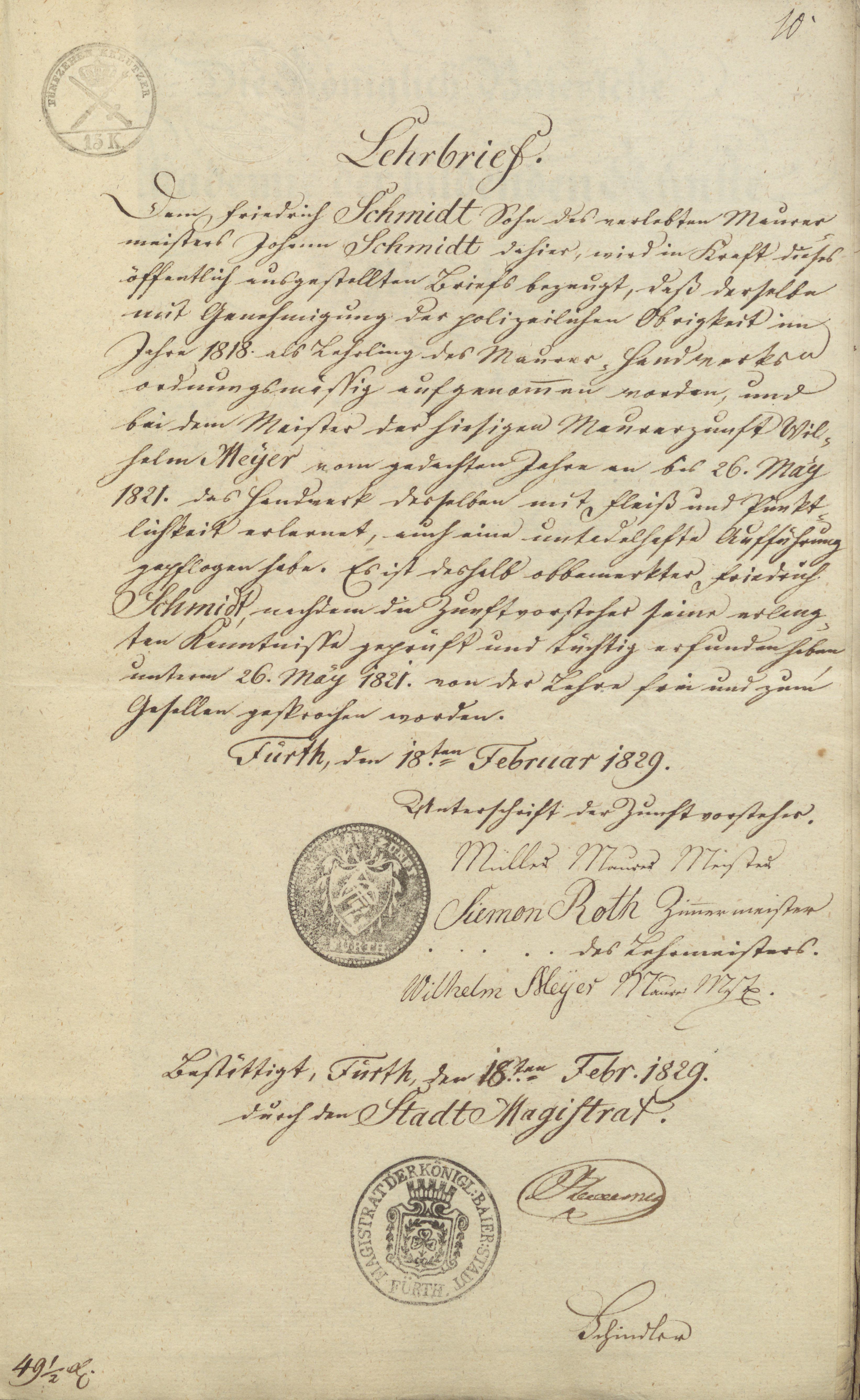 | Dateiinfo (Bild-Unterschrift und Info-Box, automatisch erstellt) | Lehrbrief für den Maurergesellen Friedrich Schmidt vom 18. Feb. 1829 Lizenz: Bildlizenz-Stadtarchiv | ||