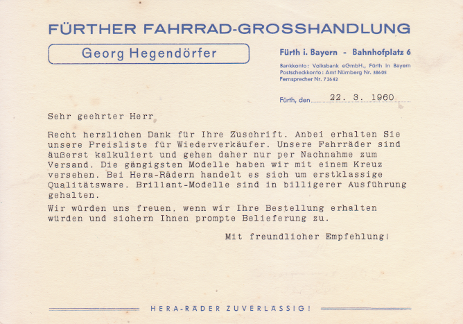 | Beschreibung | Geschäftsbrief der Fa. Fahrrad Hegendörfer von 1960 | ||