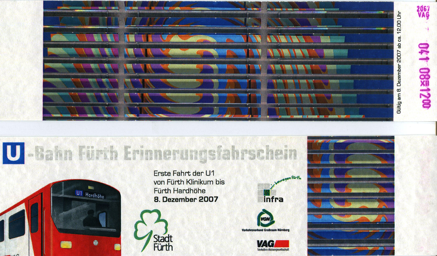 | Dateiinfo (Bild-Unterschrift und Info-Box, automatisch erstellt) | Fahrkarte für die erste Fahrt der U 1 zur neue U-Bahnhaltestelle Hardhöhe, Dez. 2007 Urheber: infra Fürth<br><br><br>Lizenz: CC BY-SA 3.0 | ||