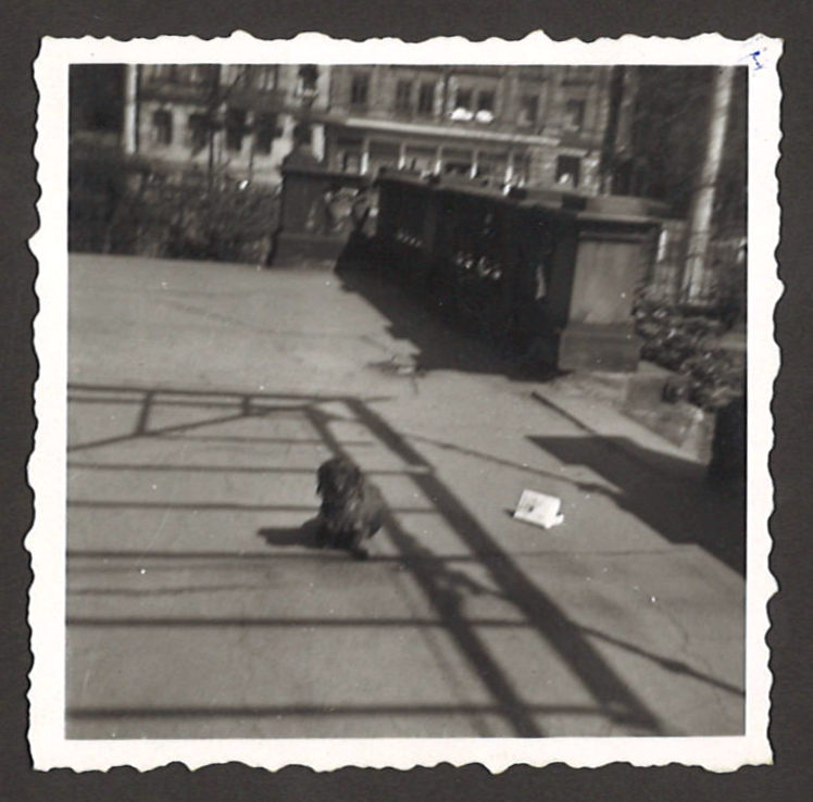 | Beschreibung | Appelscher Familienhund auf der großen Terrasse an Ostseite der Villa (im Hintergrund Hornschuchpromenade 20/21 sowie der Obstladen Nr. 20 1/2), um 1955 | ||