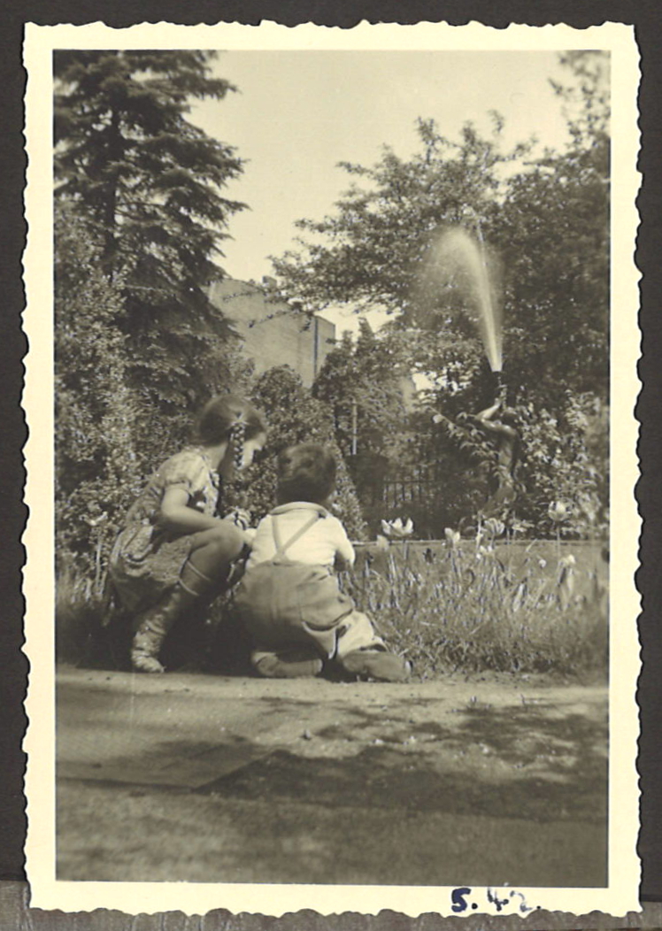| Beschreibung | Rainer Appel mit Schwester im "oberen Garten" an der Westseite der Villa (Blickrichtung zur Jakobinenstr.) Im Hintergrund ein gusseiserner Brunnen. Mai 1942 | ||