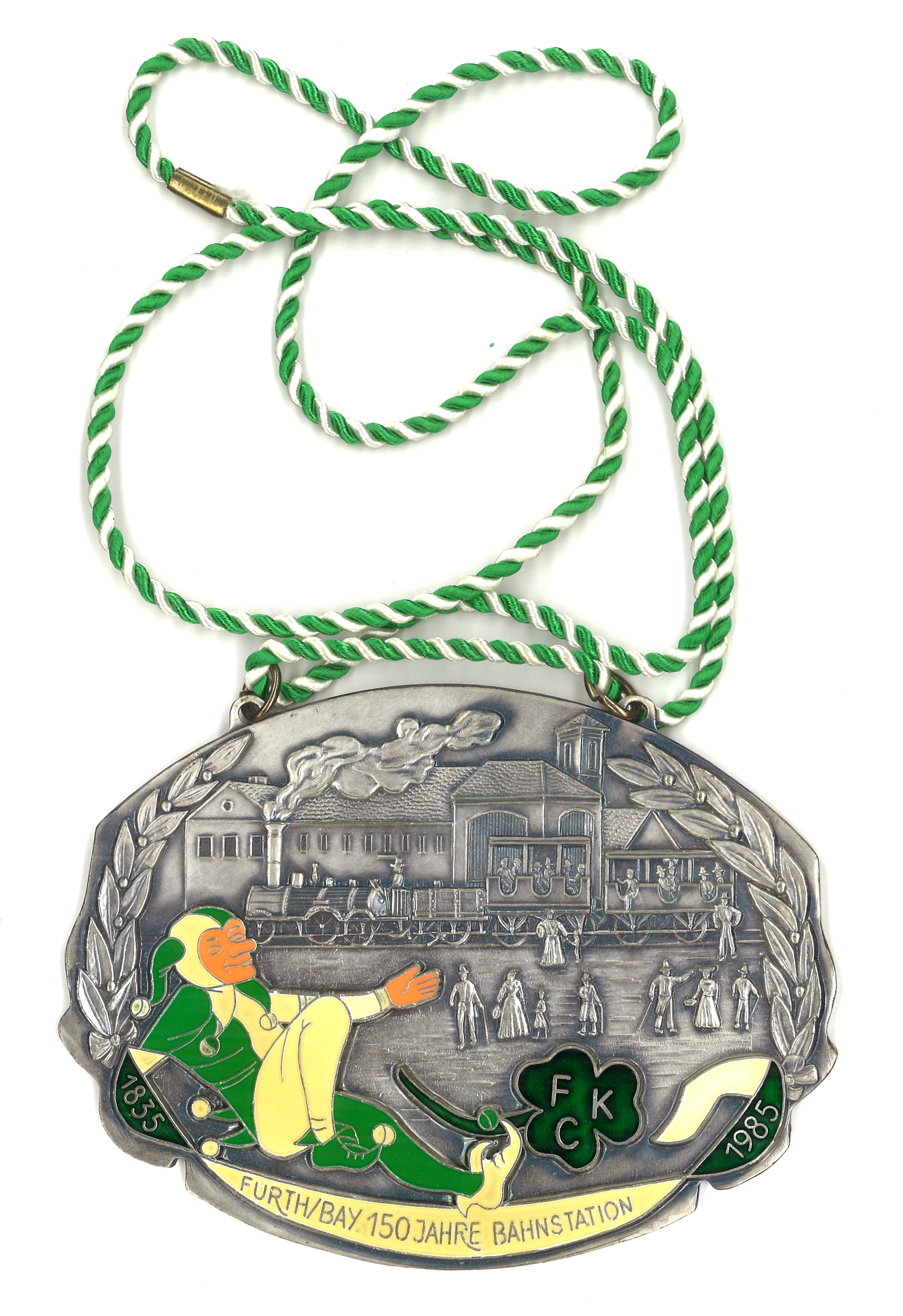 | Dateiinfo (Bild-Unterschrift und Info-Box, automatisch erstellt) | Sessionsorden der CFK, Saison 1985, Metall, Motiv „150 Jahre Deutsche Eisenbahn“ (hier ... Sessionsorden der CFK, Saison 1985, Metall, Motiv „150 Jahre Deutsche Eisenbahn“ (hier 150 Jahre Bahnstation genannt)<br>Urheber: Große Carnevalsgesellschaft "Fürther Kleeblatt" 1912 e. V.<br><br>Lizenz: CC BY-SA 3.0 | ||