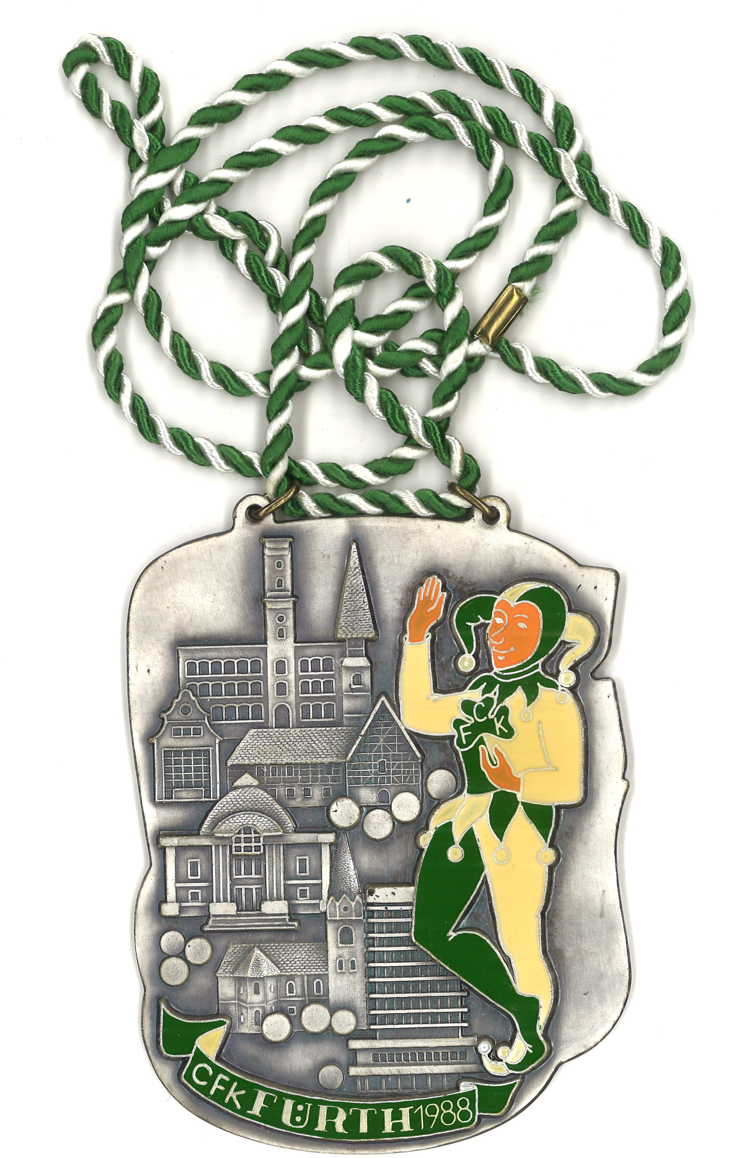 | Beschreibung | Sessionsorden der CFK, Saison 1988, Metall, Motiv „Fürther Sehenswürdigkeiten“ | ||