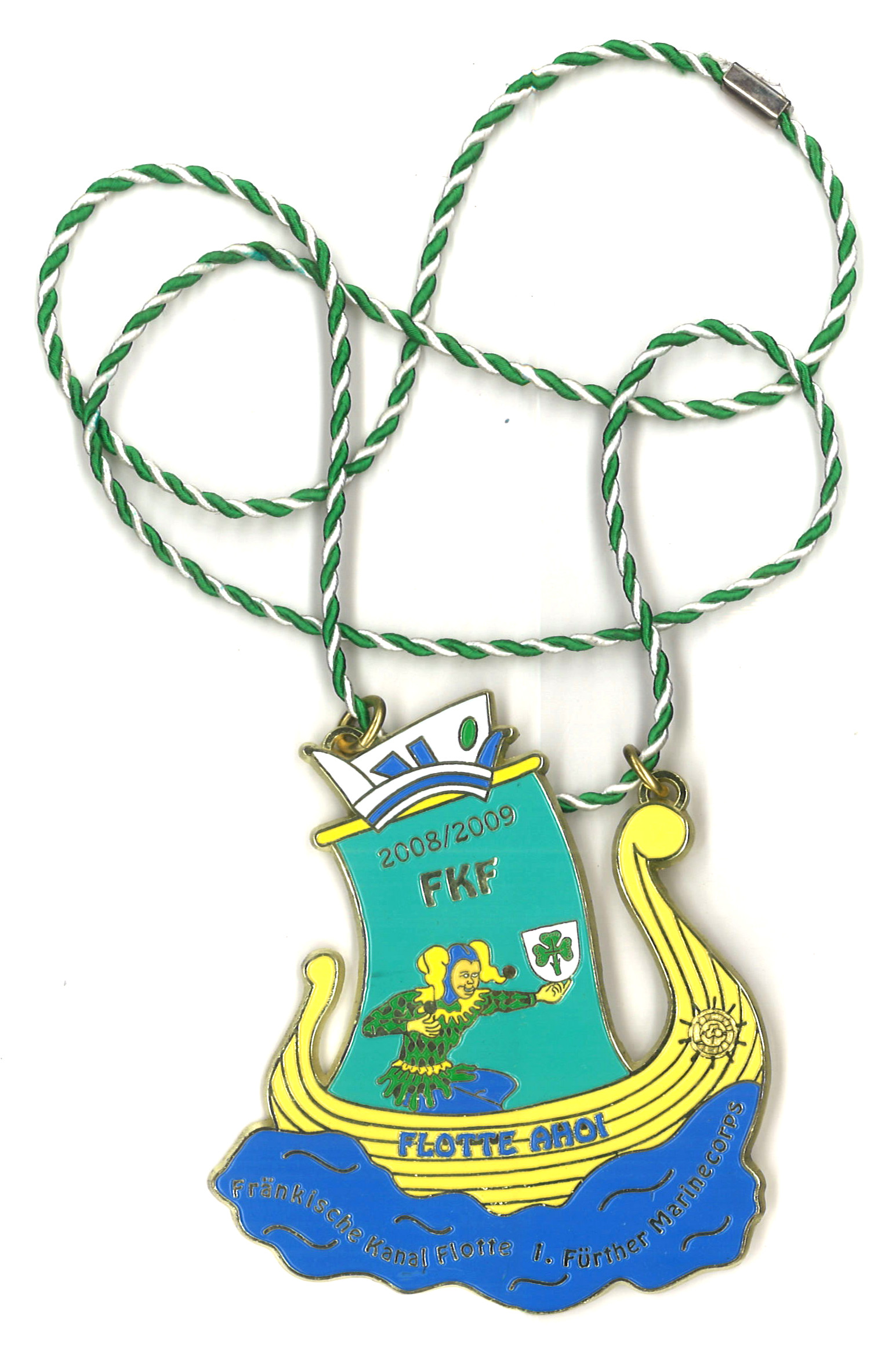 | Dateiinfo (Bild-Unterschrift und Info-Box, automatisch erstellt) | Sessionsorden der FKF, Saison 2008/2009, Metall, Motiv „Narr auf Wikingerschiff“ Urheber: Fränkische Kanal Flotte Fürth<br><br>Lizenz: CC BY-SA 3.0 | ||