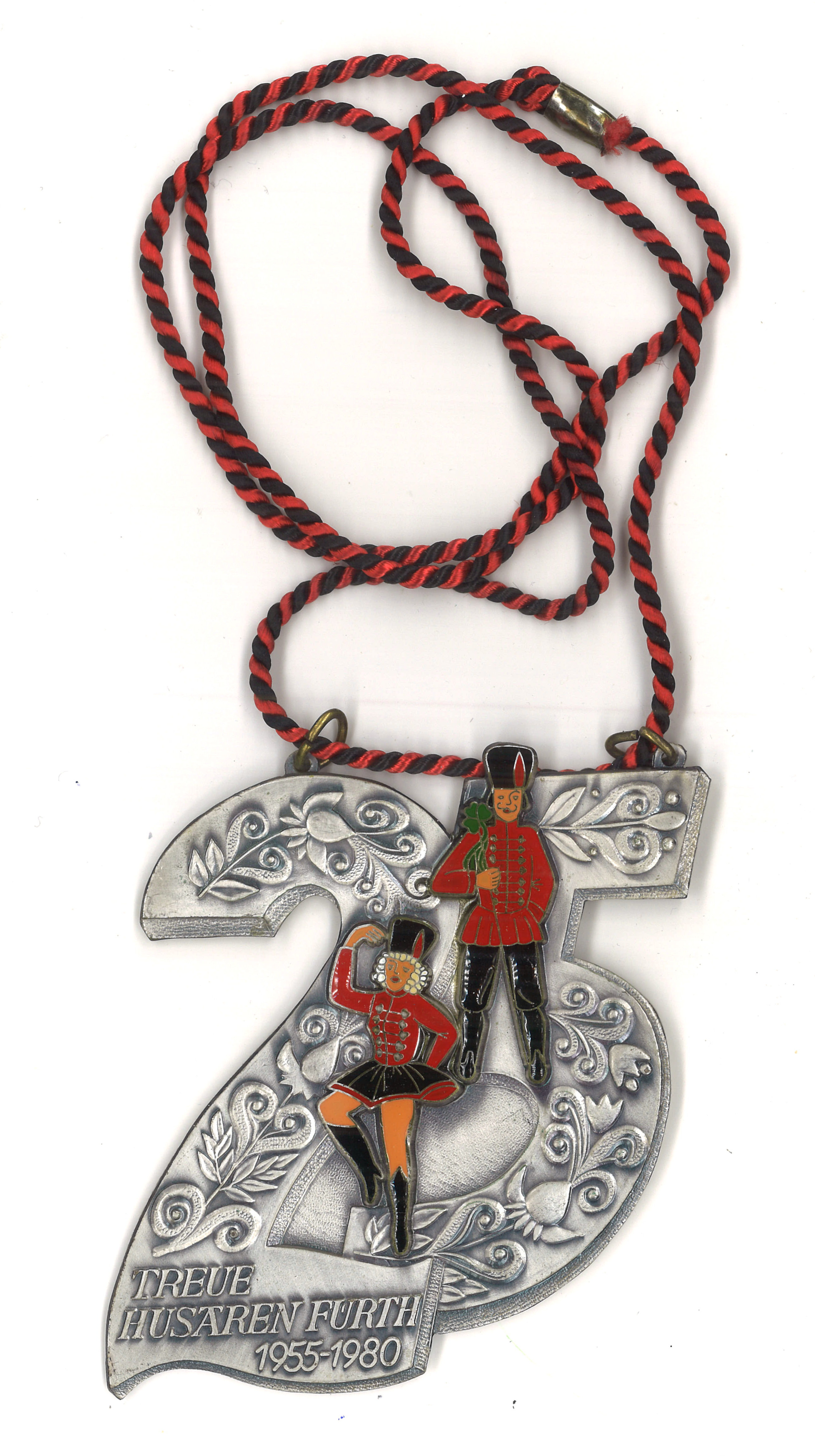 | Beschreibung | Sessionsorden der THF, Saison 1980, Metall, Motiv „25 Jahre Treue Husaren Fürth“ | ||