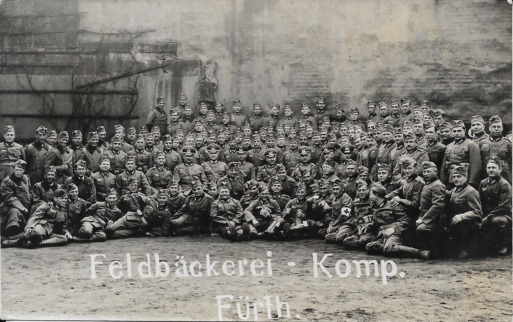 | Beschreibung | Gruppenbild der in der beschlagnahmten Grundschule Rosenstraße 1939 aufgestellten Feldbäckerei Kompanie der Wehrmacht, die zur Versorgung der Fürther Kasernen eingerichtet wurde. Nach Kriegsbeginn aufgelöst und erst nach Polen und später in die weiteren Kriegsgebiete weiter verlegt. | ||