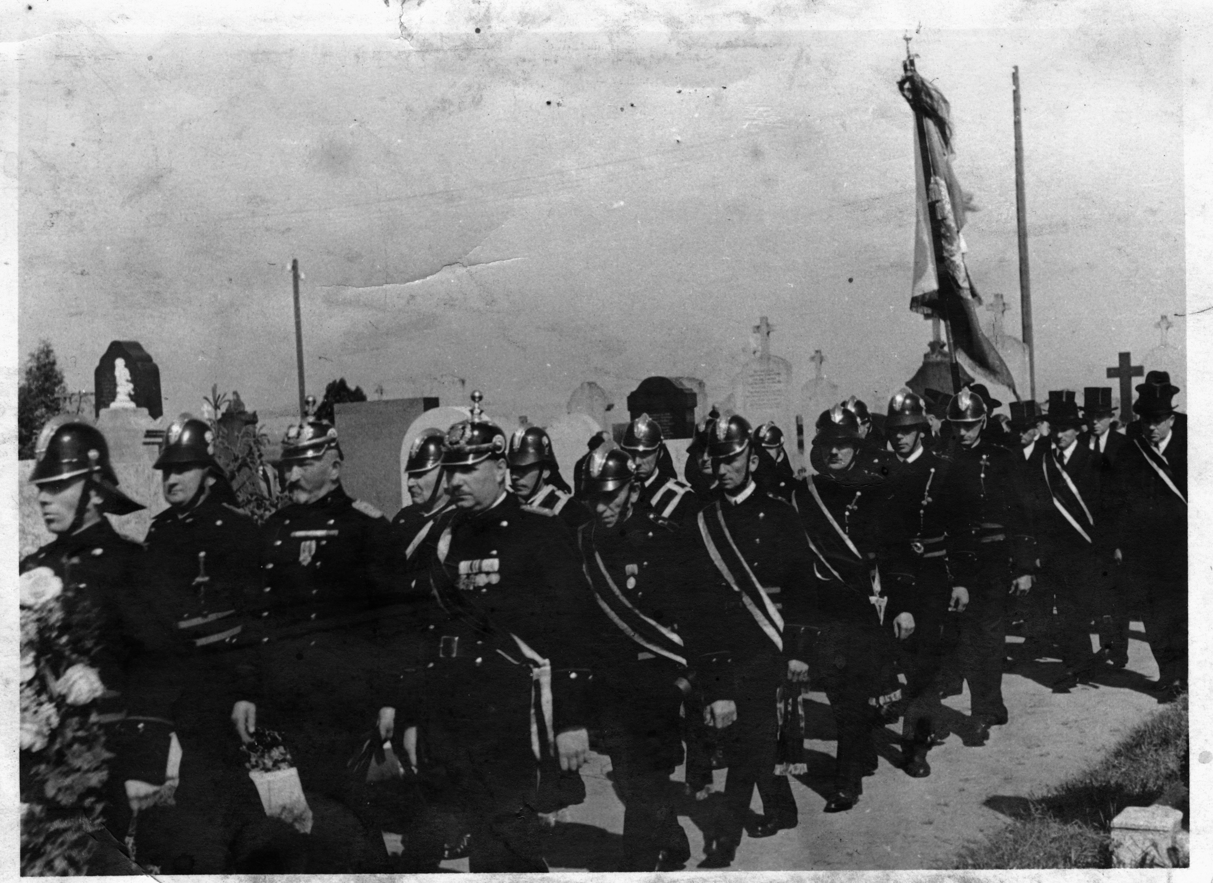 Bei dem Gedenken für die Gefallenen, nahm (und nimmt) der Zug der Vereine am Poppenreuther Friedhof Aufstellung, um dann zur Kirche zu gehen. Hier vorneweg mit Helm die Feuerwehr - zuvorderst der Kommandant Georg Ringel. Mit Zylinder der Gesangsverein Liederkranz.