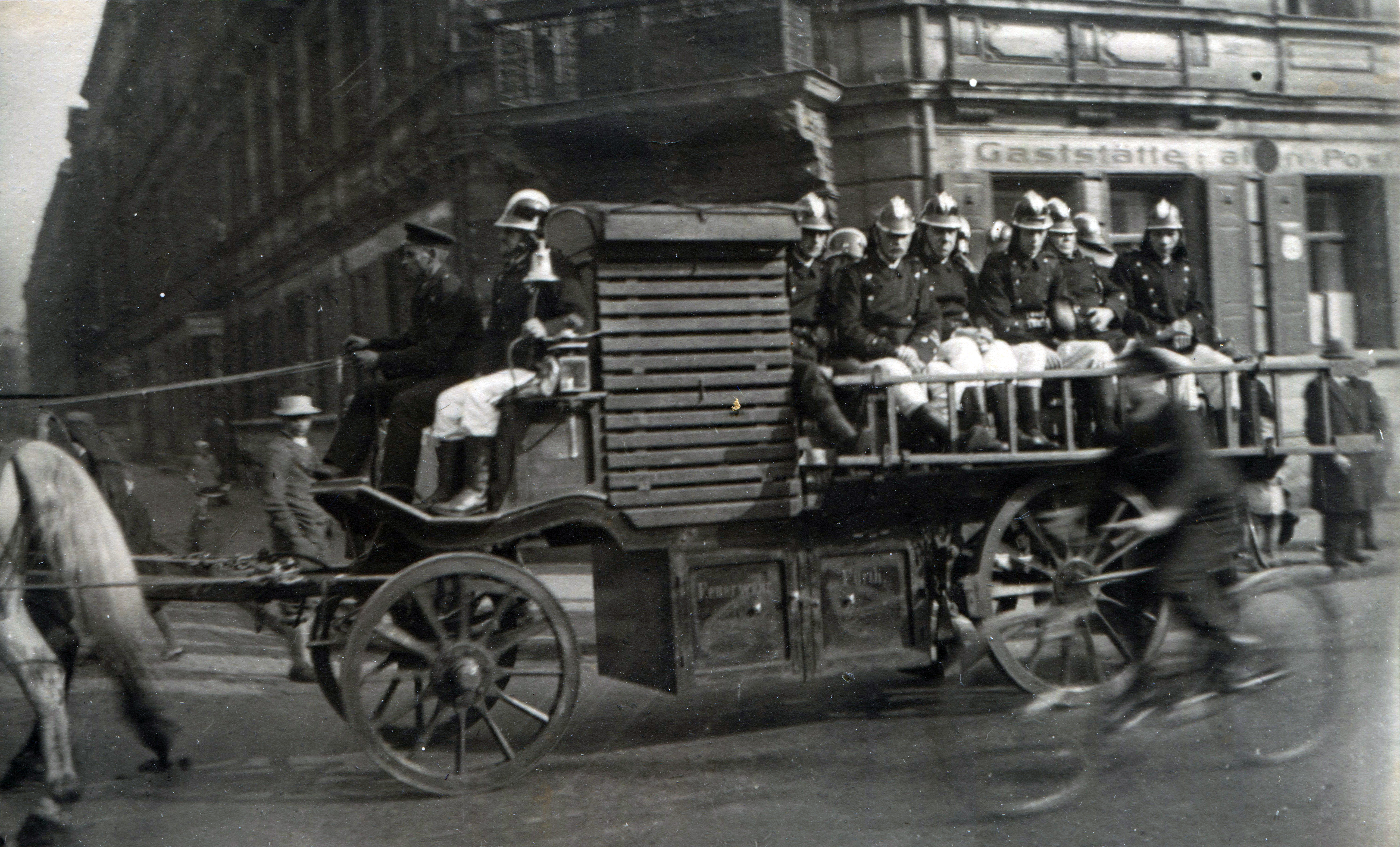 | Beschreibung | Die Feuerwehr in der Nürnberger Straße - Ecke Sommerstraße, im Hintergrund die Gaststätte Zur Alten Post, ca. 1910 | ||