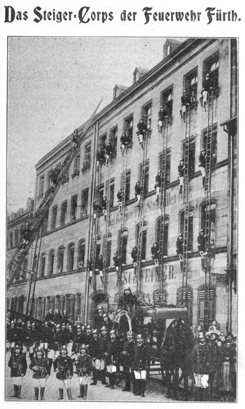 | Dateiinfo (Bild-Unterschrift und Info-Box, automatisch erstellt) | Das "Steiger-Corps"; Abb. in der Festzeitung für den IX. Bayer. Feuerwehrtag zu Fürth, 18. - 21. ... Das "Steiger-Corps"; Abb. in der Festzeitung für den IX. Bayer. Feuerwehrtag zu Fürth, 18. - 21. August 1900<br><br>Lizenz: CC BY-NC-SA 4.0 | ||