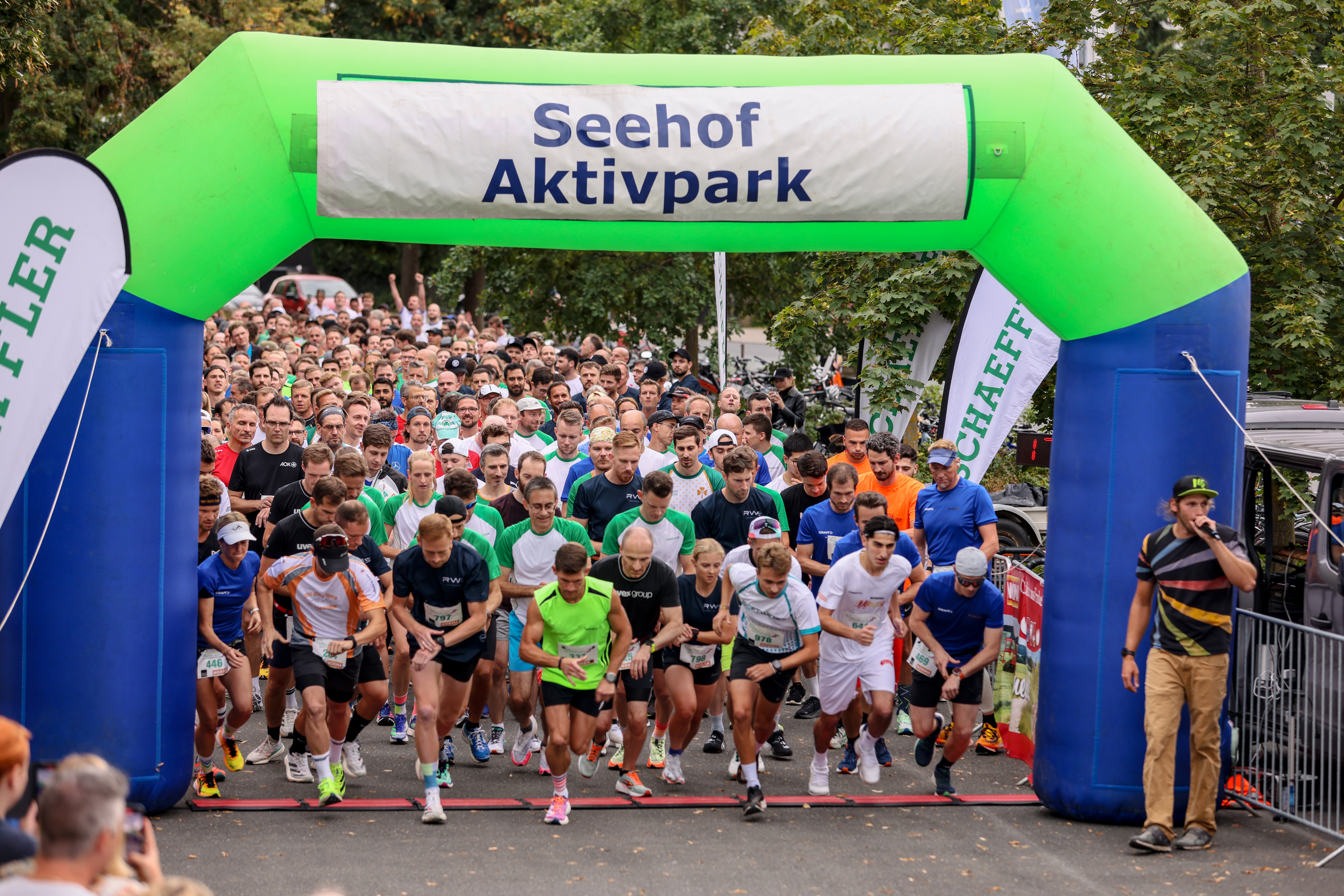 | Beschreibung | Start des 13. Firmenlaufs am Scherbsgraben - in Neonoberteil schnellster Läufer 2022 und 2023: Sascha Lorenz, Sept. 2023 | ||