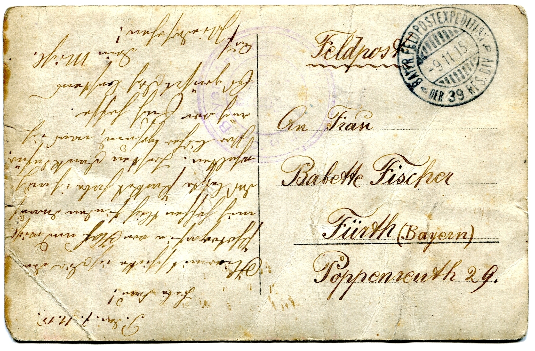 | Beschreibung | Feldpostkarte von Michael Fischer an seine Frau Babette, wohnhaft Poppenreuth, Haus Nr. 29 ("Schwarzer Adler"), 1915 (Rückseite) | ||