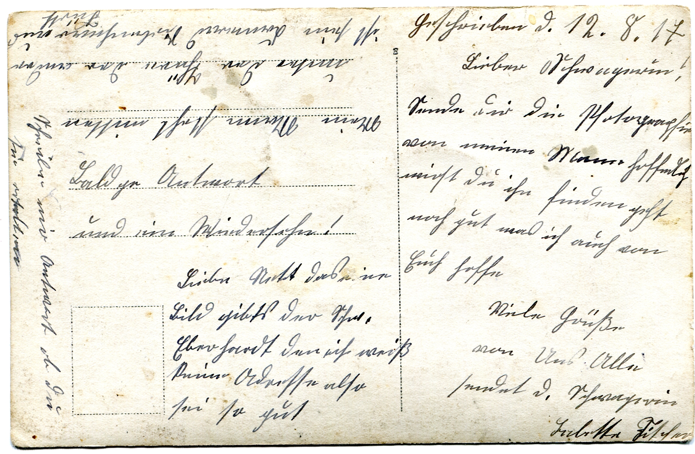 BeschreibungFeldpostkarte von Michael Fischer - wohnhaft Poppenreuth, "Schwarzer Adler" - an seine Schwester, 1917 (Rückseite)