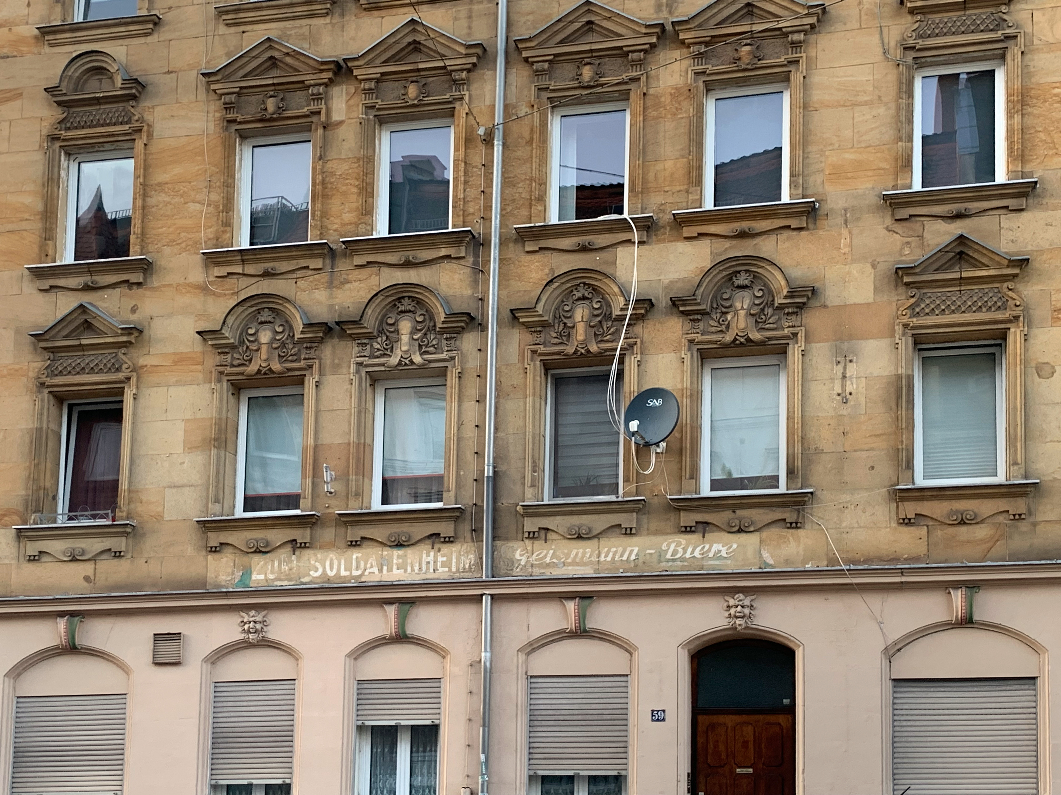 | Beschreibung | Flößaustraße 59 – noch gut erkennbar die ehem. Nutzung im Erdgeschoss: die Gaststätte "Zum Soldatenheim" mit Bier von der Brauerei Geismann, März 2022 | ||