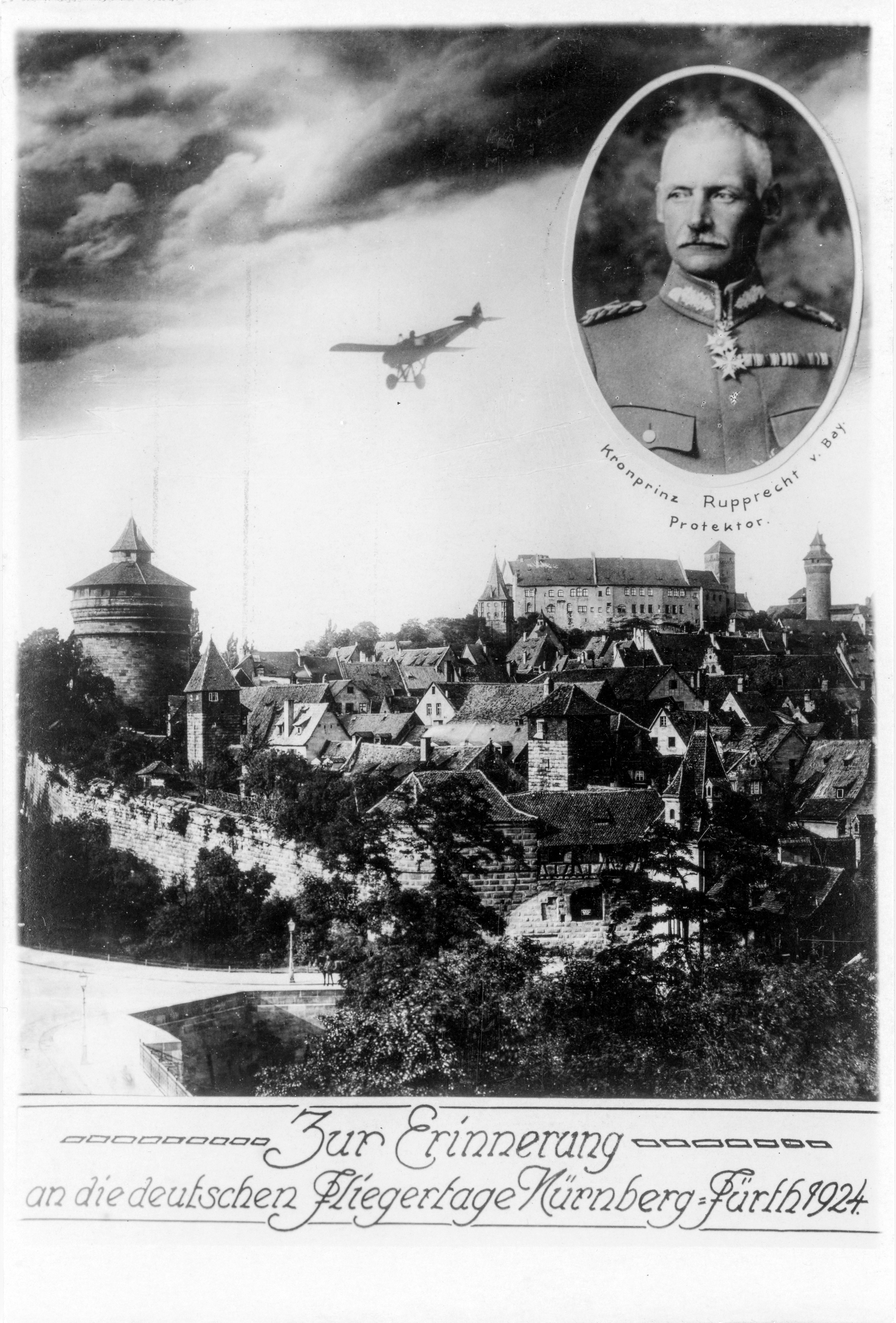 | Beschreibung | Ansichtskarte zur Deutschen Fliegertage Nürnberg-Fürth von 1924 mit Kronprinz Rupprecht von Bayern | ||