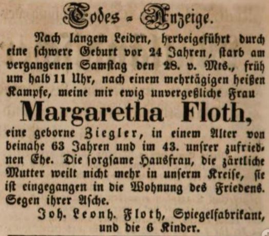| Dateiinfo (Bild-Unterschrift und Info-Box, automatisch erstellt) | Traueranzeige für Margaretha Floth, 1846 Lizenz: NoC-NC 1.0 | ||