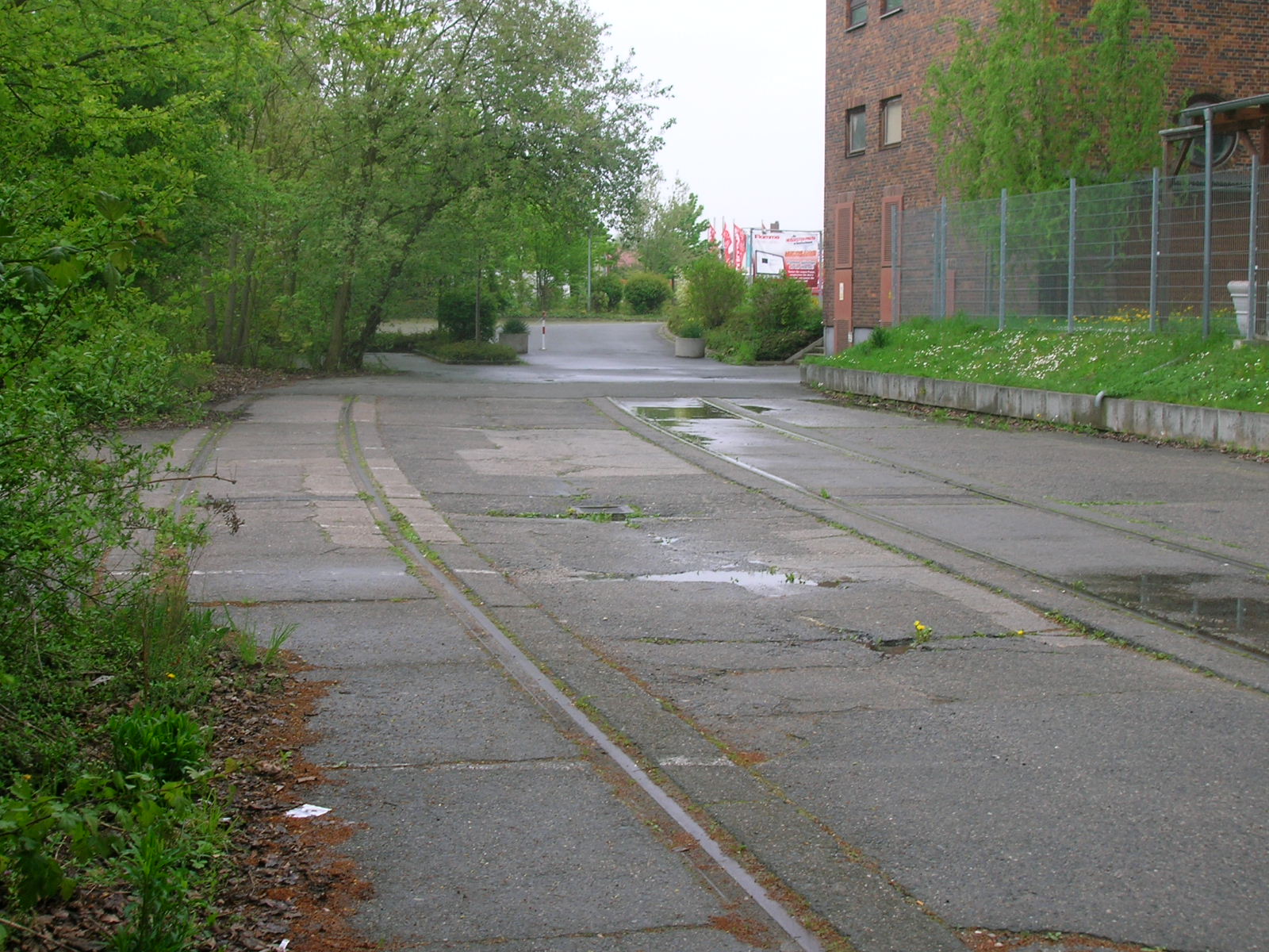 | Beschreibung | Im Sommer 2015 sind am Klinkerbau des früheren Industrieflughafens noch alte Anschlussgleise an die Flughafenbahn vorhanden. | ||