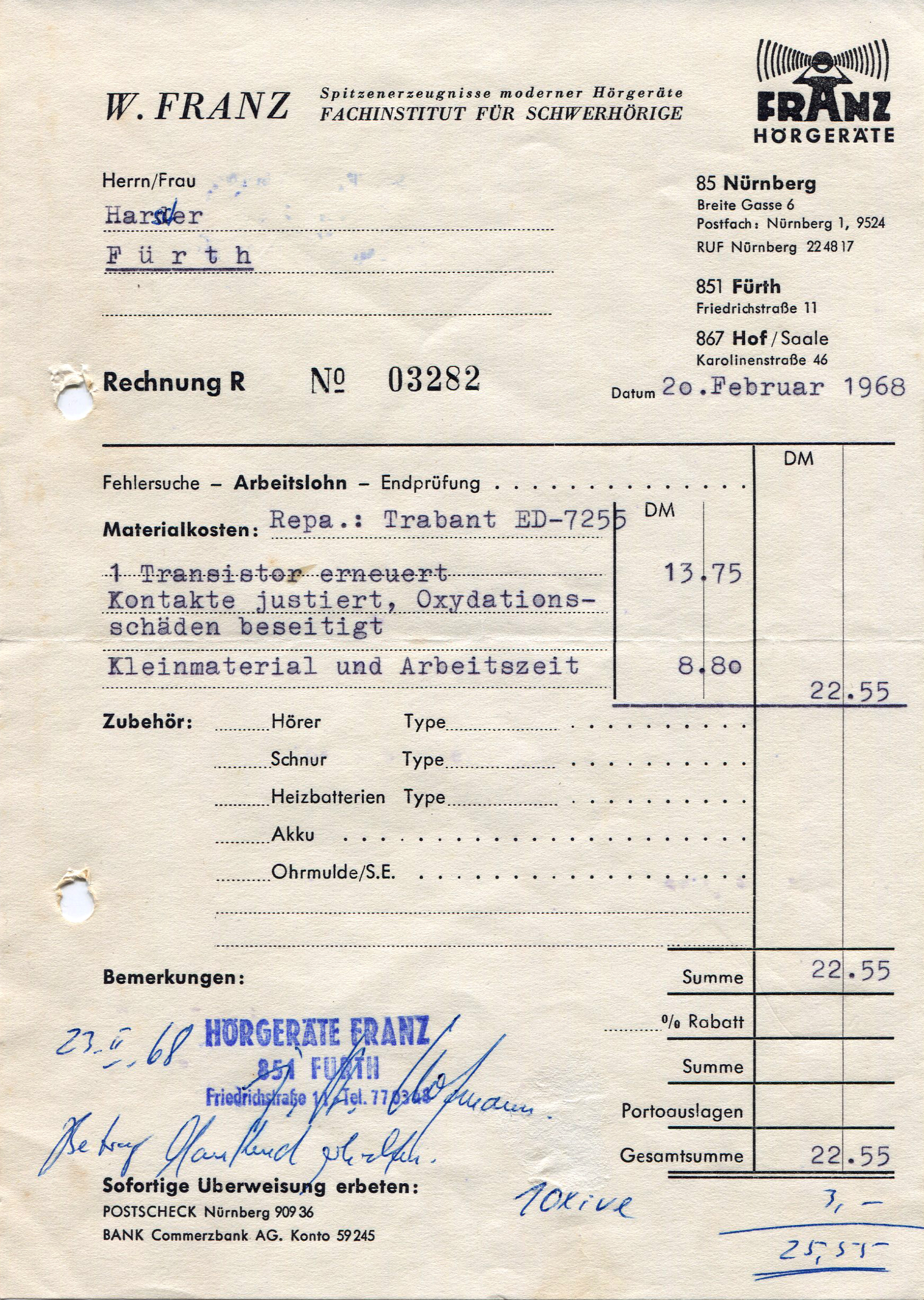 | Beschreibung | Briefkopf der Fa. Franz Hörgeräte in der Friedrichstraße 11, 1968 | ||
