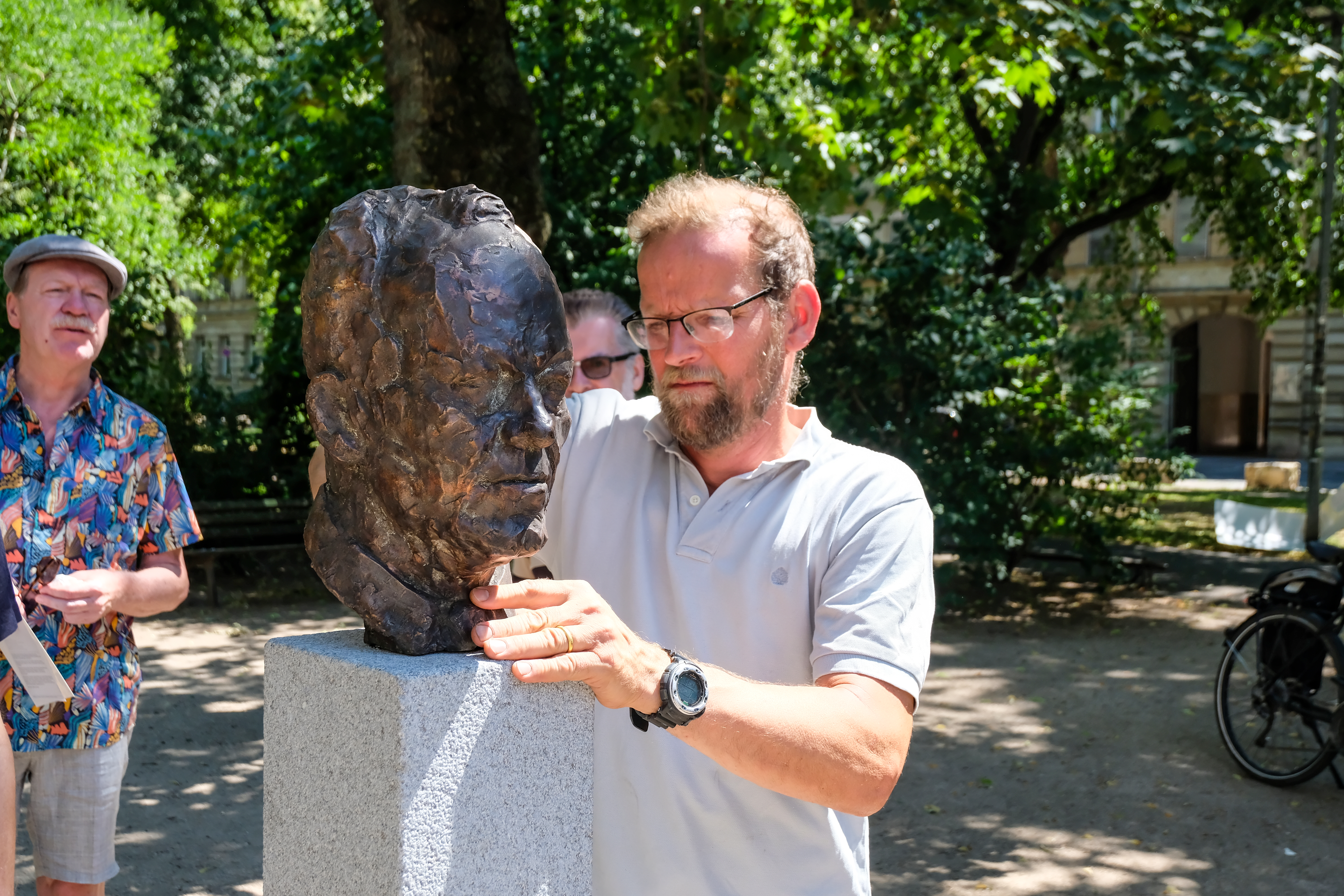 | Beschreibung | Kunstinstallation von Christian Rösner mit Bronzebüste von Willy Brandt an der Hornschuchpromande während der Frei Luft Galerie 2023, Juni 2023 | ||