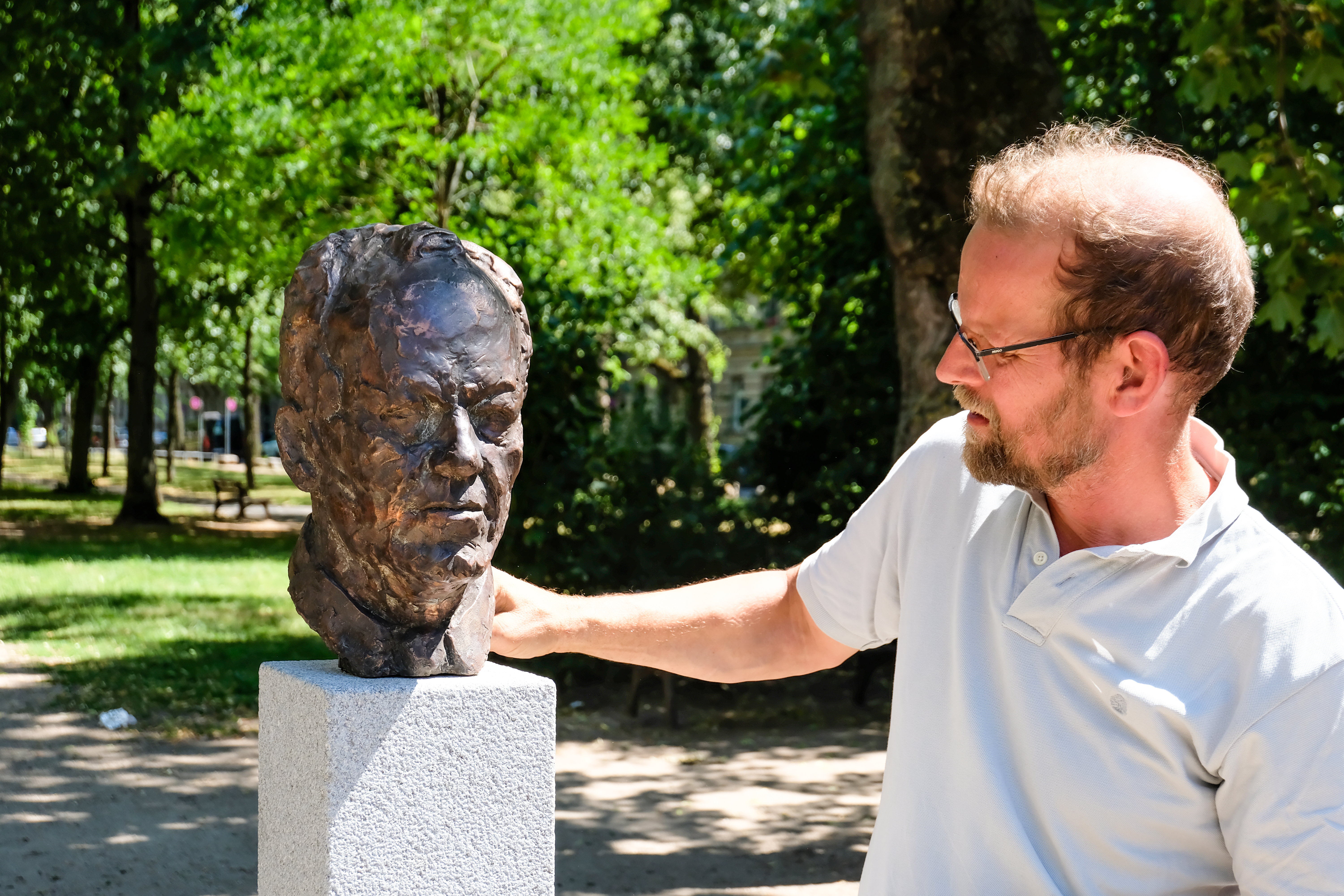 | Beschreibung | Kunstinstallation von Christian Rösner mit Bronzebüste von Willy Brandt an der Hornschuchpromande während der Frei Luft Galerie 2023, Juni 2023 | ||