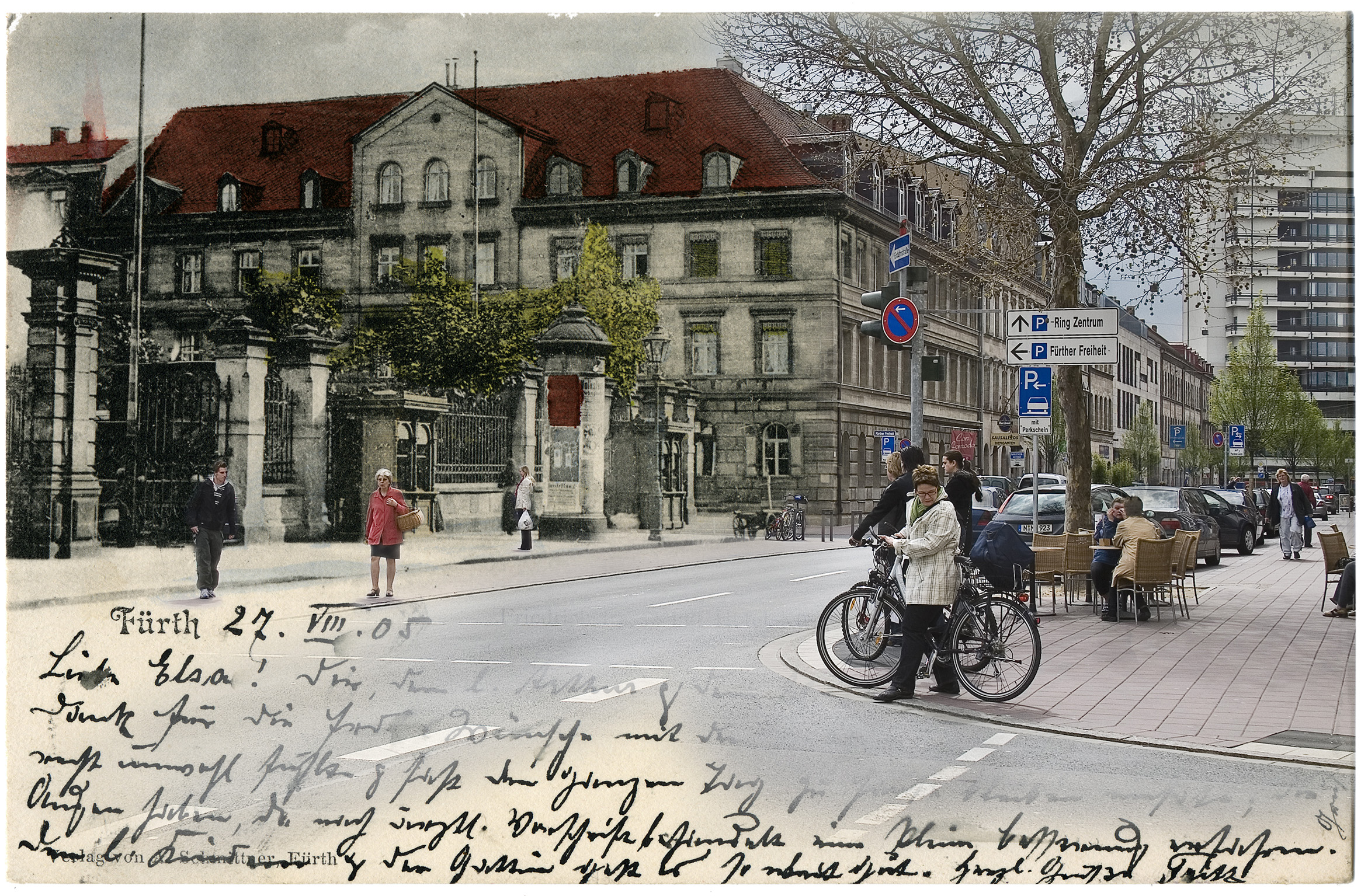 | Beschreibung | "Zeitsprung"-Bildmontage (historische Postkarte und neues Foto vom gleichen Ort ineinander gemischt) | ||