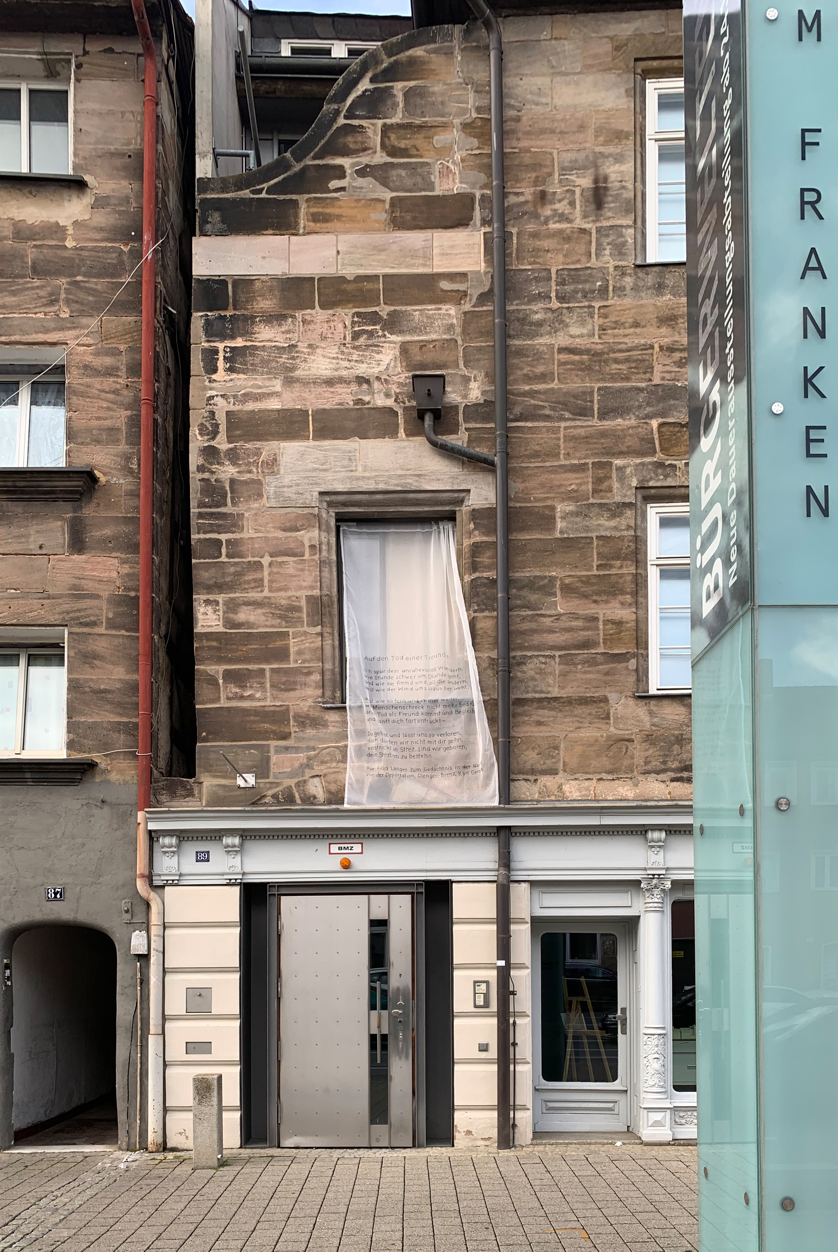 | Beschreibung | Kunstaktion am Jüdischen Museum Franken in Fürth - zur Erinnerung an den Freitod Frida Langer im Jahr 1942, kurz vor Ihrer geplanten Deportation | ||
