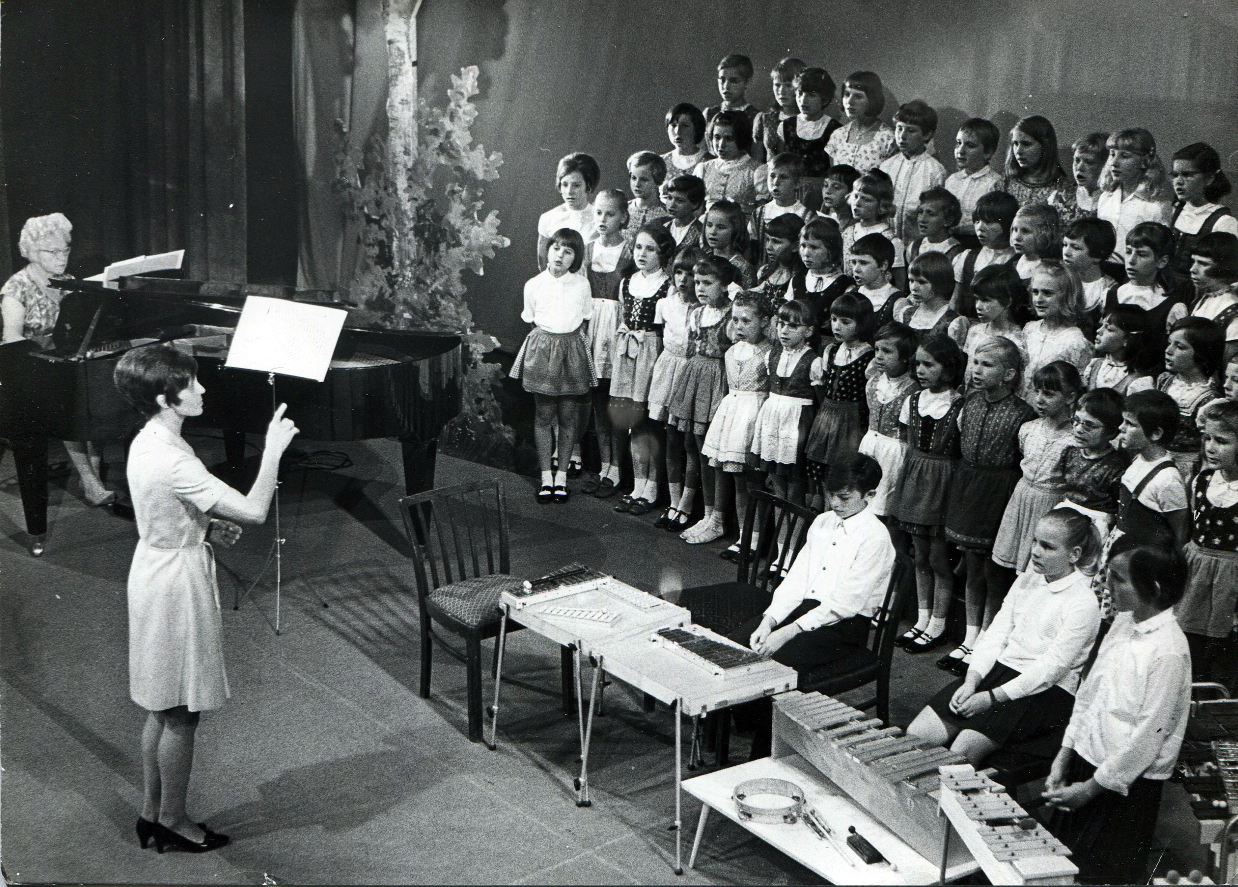 | Beschreibung | Chor der Friedrich-Ebert-Schule, links am Klavier Fr. Baer, Chorleitung Fr. Mehnert, 1960 | ||