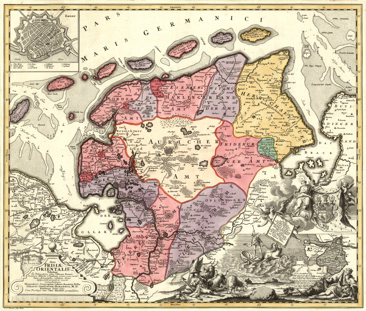 | Beschreibung | "Hanc Frisiae Orientalis Tabulam", Nürnberg 1730 (Kupferstecher: R. A. Schneider) | ||