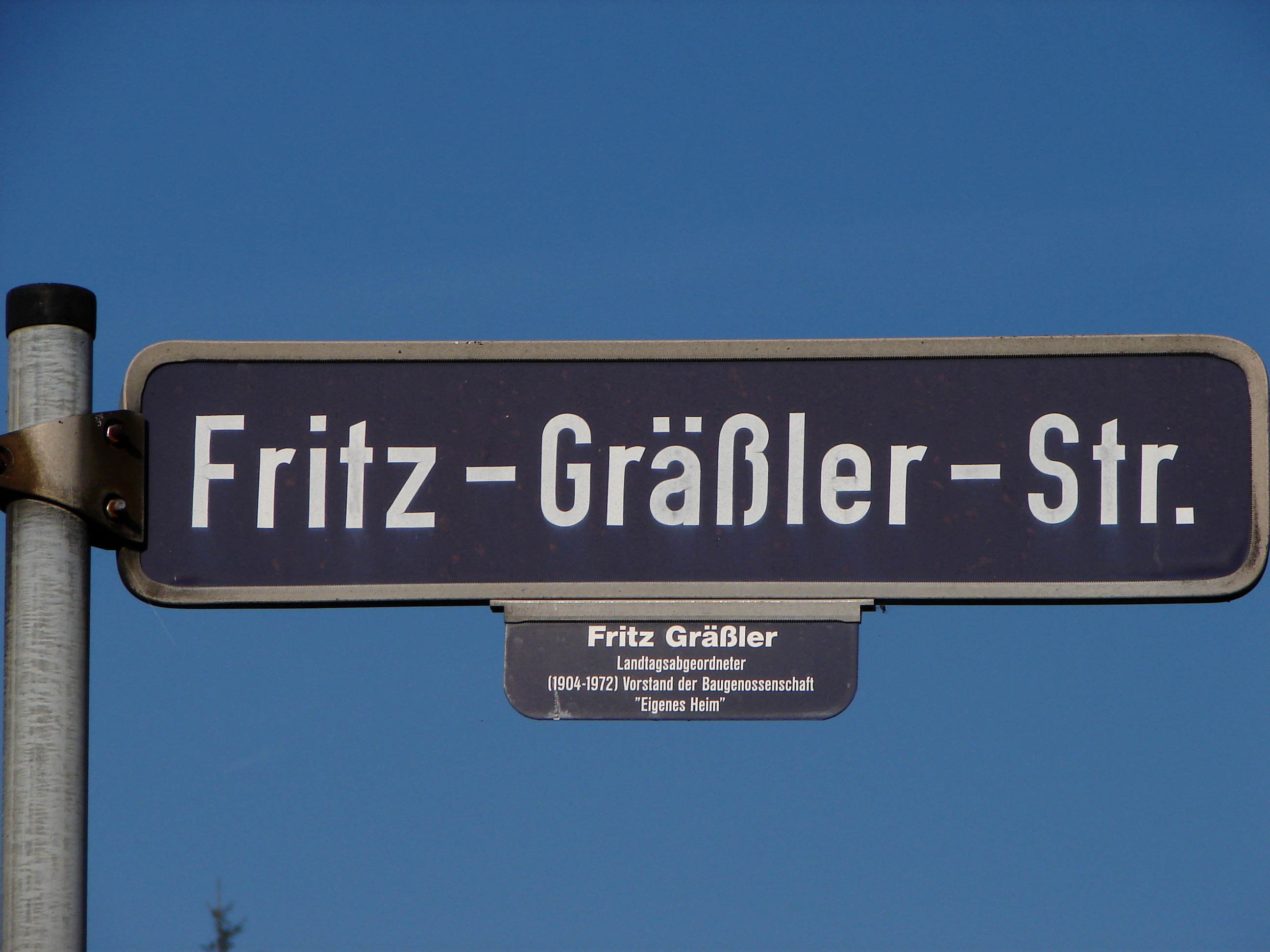 | Dateiinfo (Bild-Unterschrift und Info-Box, automatisch erstellt) | Straßenschild Fritz-Gräßler-Straße mit Erläuterung Urheber: Baringel<br><br><br>Lizenz: CC BY-SA 3.0 | ||