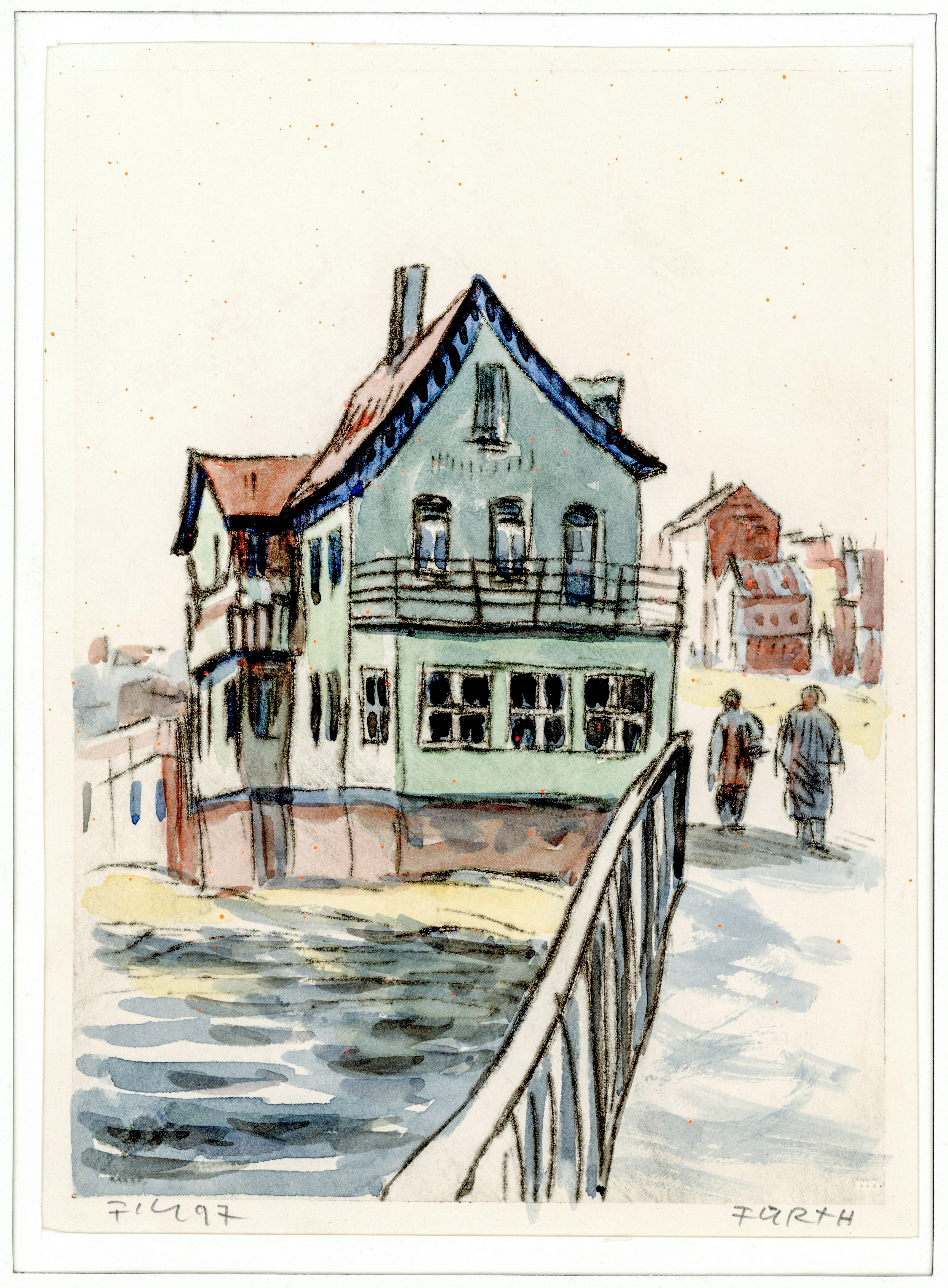 | Beschreibung | Zeichnung von Fritz Lang - die ehem. Gaststätte Fischhäusla bei der Foerstermühle an der Würzburger Straße, 1997 | ||
