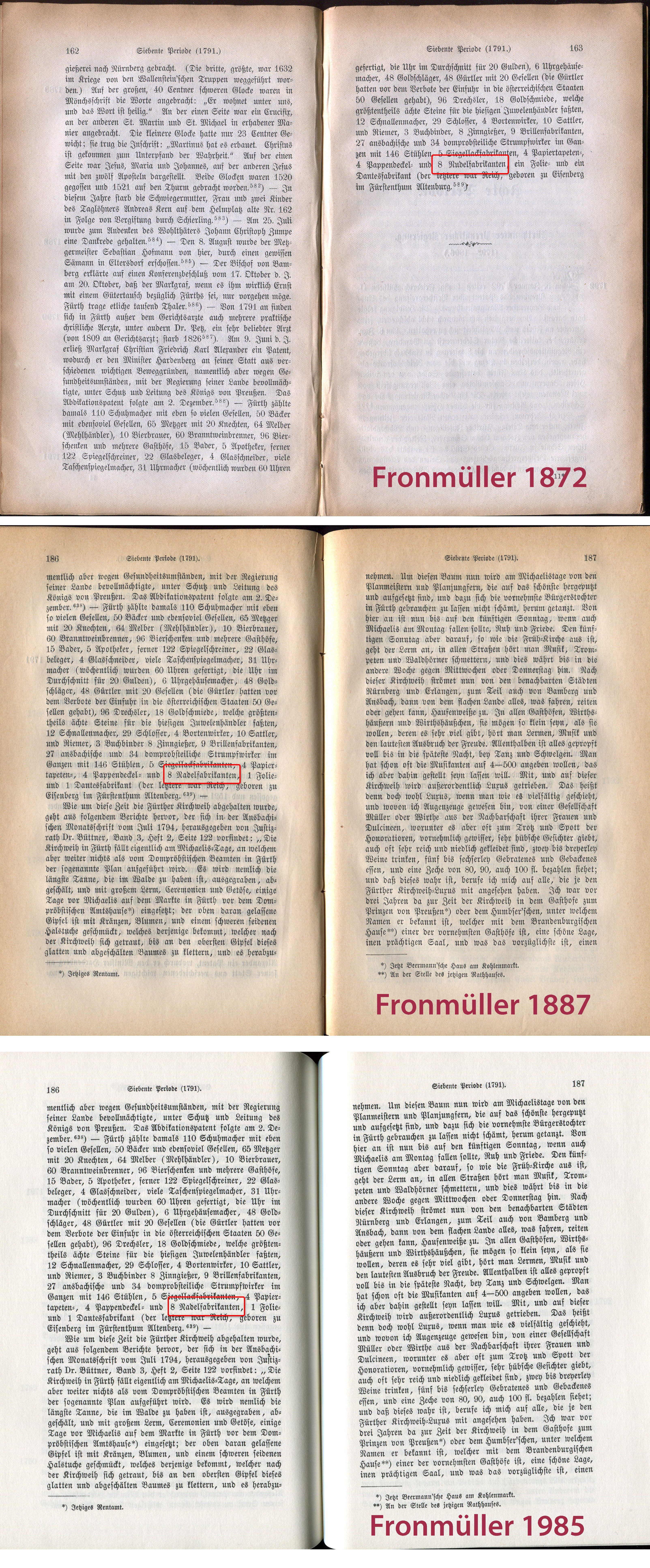 | Dateiinfo (Bild-Unterschrift und Info-Box, automatisch erstellt) | Drei verschiedene Auflagen des Buchs "Chronik der Stadt Fürth" von 1872, 1887 und 1985 - mit der ... Drei verschiedene Auflagen des Buchs "Chronik der Stadt Fürth" von 1872, 1887 und 1985 - mit der textlichen Änderung von Nudelfabriken zu Nadelfabriken<br><br> | ||