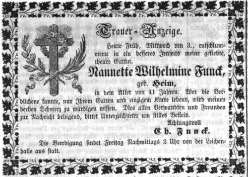 | Dateiinfo (Bild-Unterschrift und Info-Box, automatisch erstellt) | Traueranzeige für Nannette Wilhelmine Funck, Juni 1857 Lizenz: NoC-NC 1.0 | ||