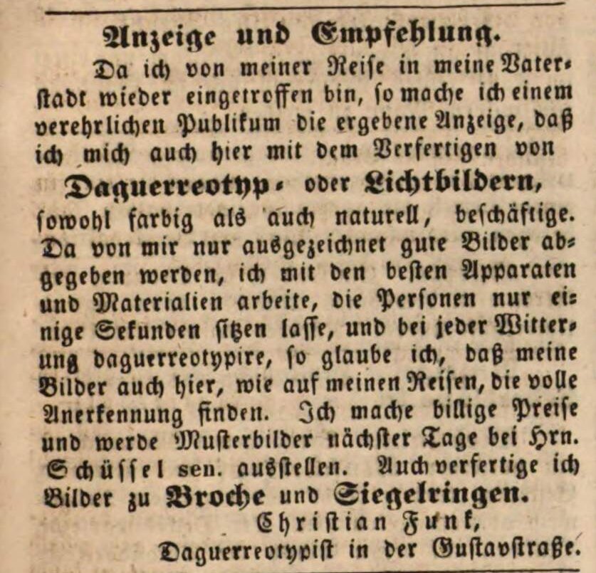 | Beschreibung | Zeitungsannonce des Daguerreotypisten Christian Funk, Oktober 1848 | ||
