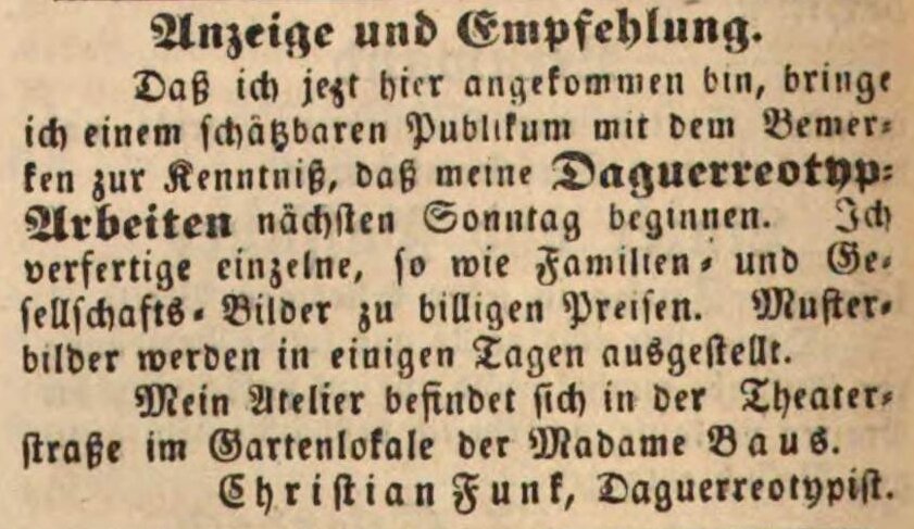 | Beschreibung | Zeitungsanzeige des Daguerreotypisten Christian Funk, Mai 1849 | ||