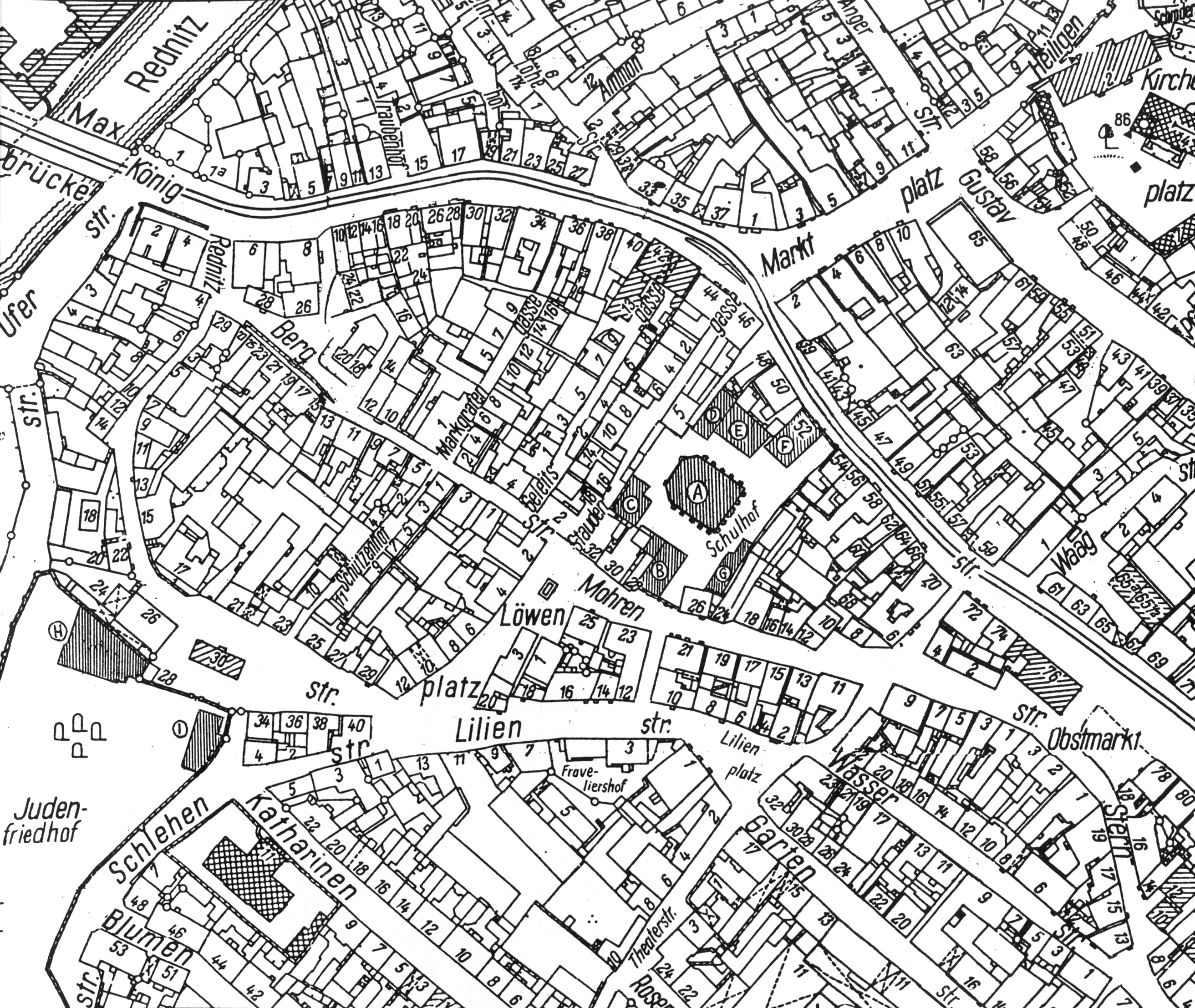 Legende: A= Altschul (Hauptsynagoge), B= Neuschul, C= Scharre (Kleintierschächterei), D= Klaus-Synagoge, E= Mannheimer- oder Winterschul, F= Rabbinerwohnhaus mit Gemeindeverwaltung, G= Hausmeisterwohung, H= alte jüdisches Krankenhaus, I= Leichenhalle