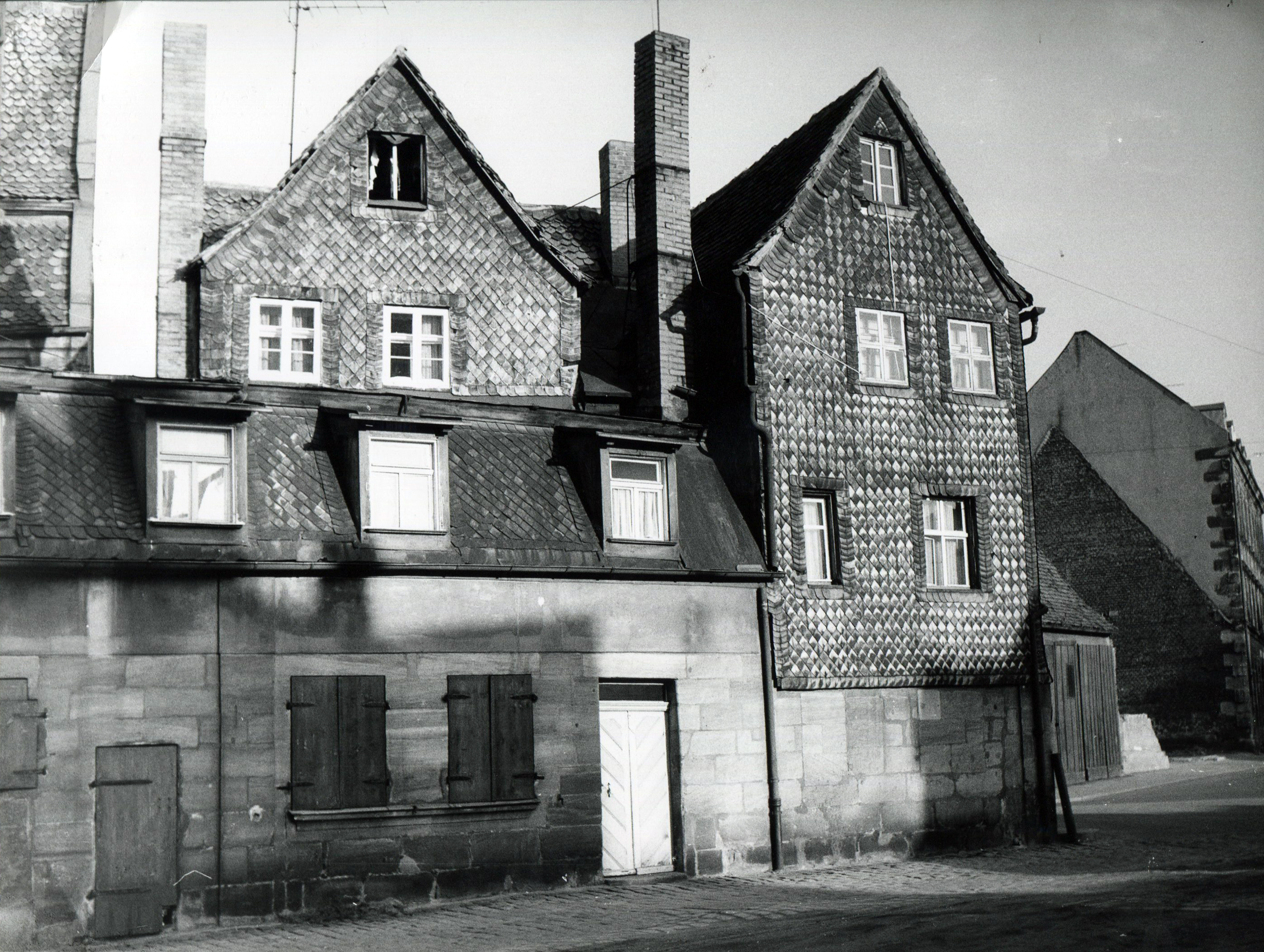 | Beschreibung | Rückseite von Rednitzstr. 38 (ganz links) und 40 von der Schlehenstraße aus gesehen. Im Hintergrund Löwenplatz 8 mit Giebelabdruck der bereits abgerissenen Scheune Nr. 10, ca. 1970 | ||