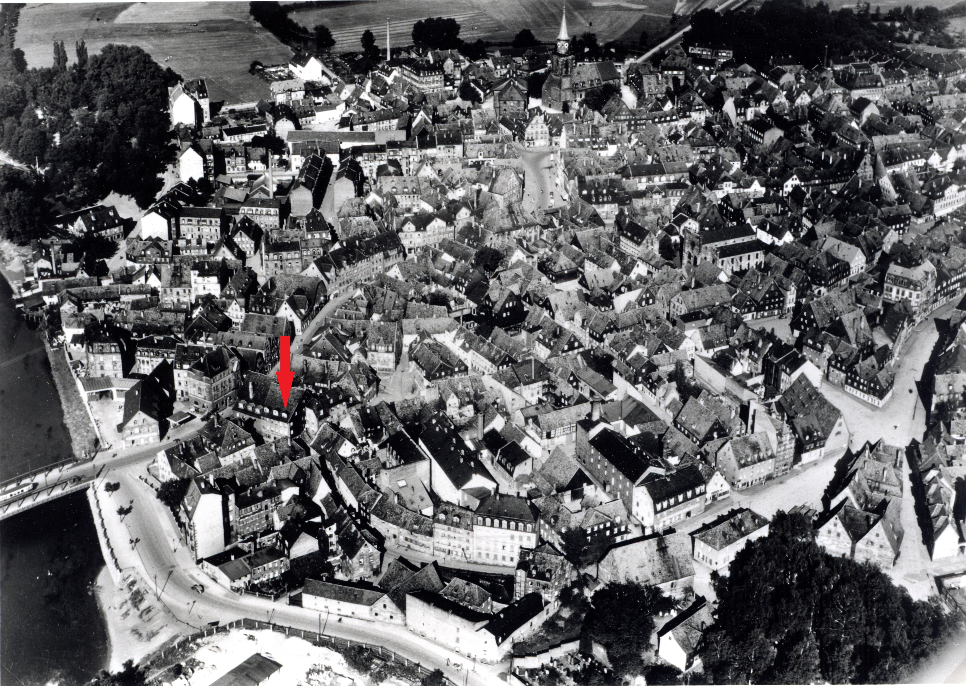 | Beschreibung | Gänsberg Luftbild 1935 mit Rednitzstraße 1 (Zum schwarzen Bock) rot markiert | ||