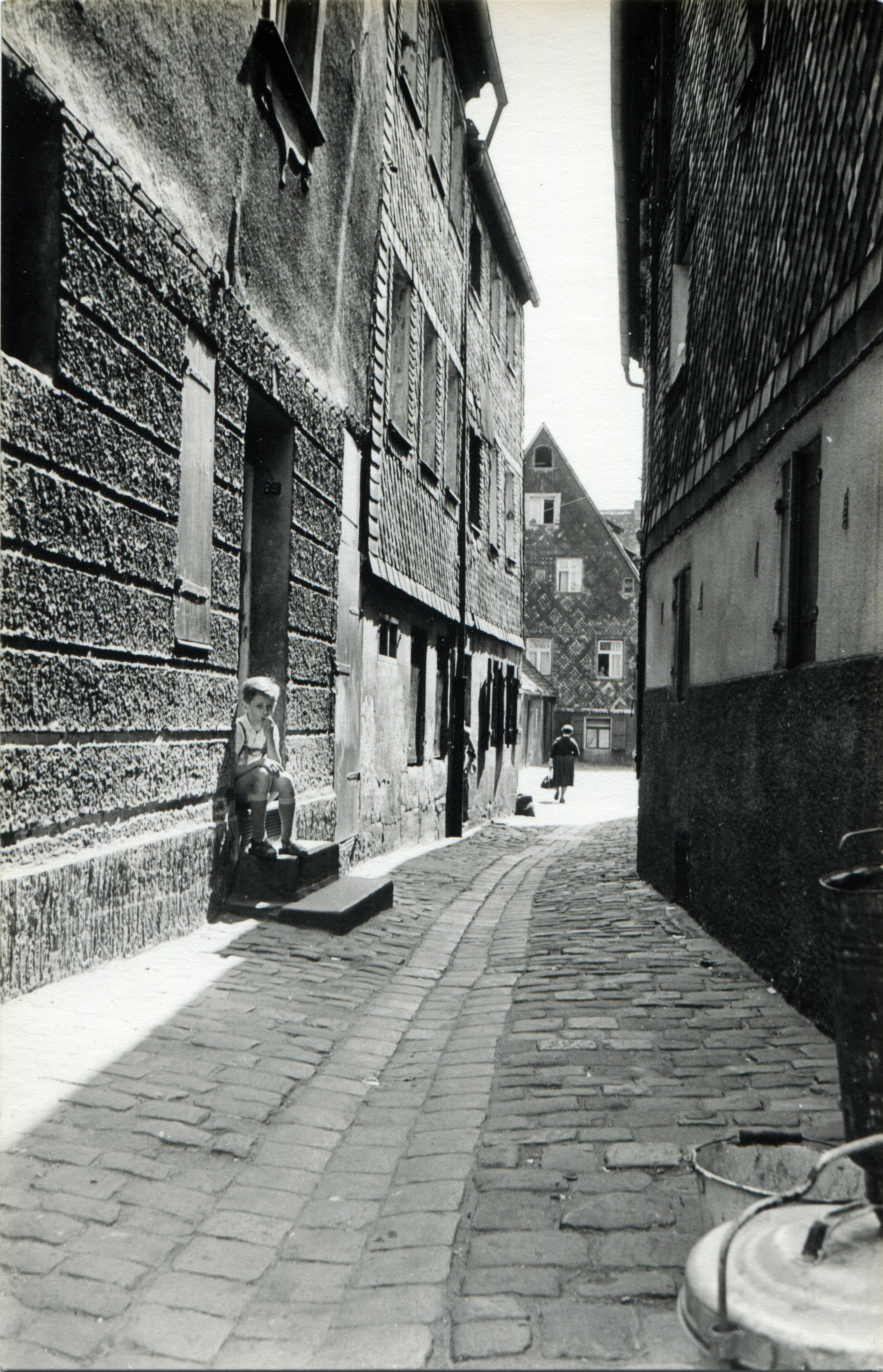 | Beschreibung | Schützenhof von der Bergstraße gesehen, ca. 1955. Links Schützenhof 1 und 3; die Nummern 5, 7 und 9 sind nach hinten versetzt, sodass ein Hofcharakter entsteht. Bildmitte Schützenhof 11 (verschieferter Giebel); rechts Bergstraße 5 | ||