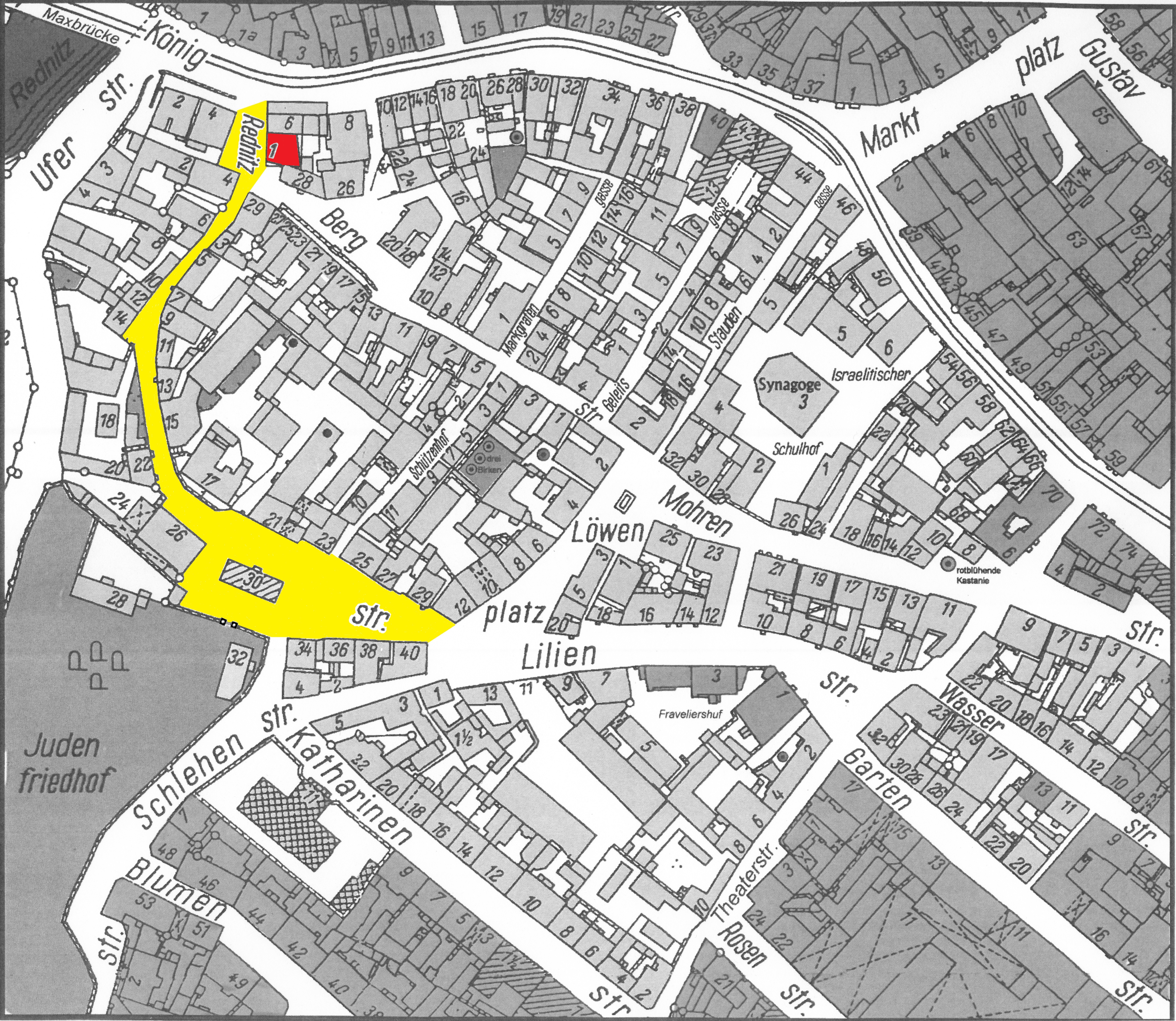 | Beschreibung | Rednitzstraße 1, "Restauration zum schwarzen Bock" - rot markiert da zur Planerstellung nicht mehr existent; Rednitzstraße, gelb markiert | ||