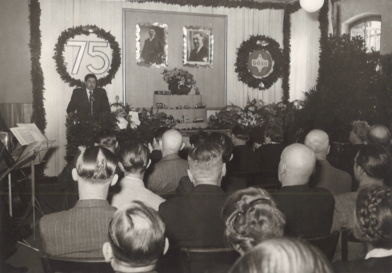 | Beschreibung | Jubiläum "75 Jahre Göso", 1951, Ansprache von Inhaber Georg Götz in der Werkshalle Dr.-Mack-Str. 32 - 38. | ||