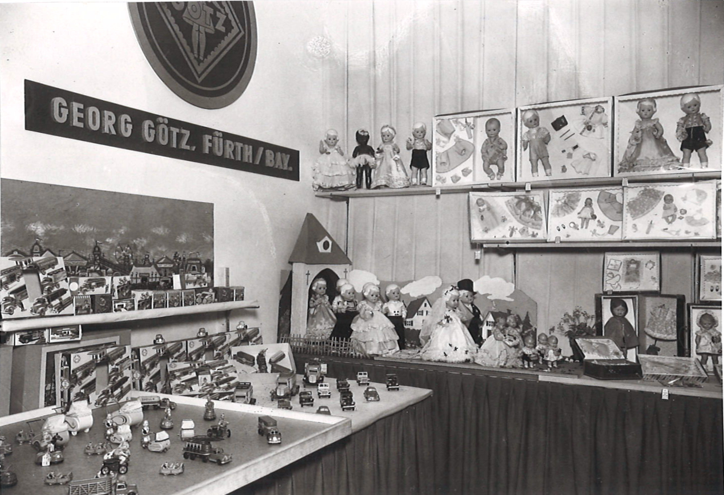 | Beschreibung | Göso-Messestand mit Präsentation der Fa. Georg Götz GmbH bei der ersten Spielwarenmesse in Nürnberg vom 12. - 18. März 1950 im Wieselerhaus. | ||