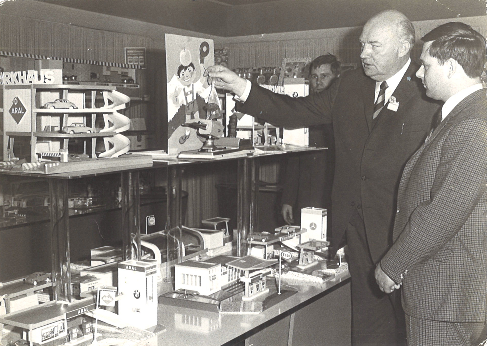 | Beschreibung | Peter Götz und Wilhelm Bühner (Prokurist bei Göso) bei einer Spielwarenpräsentation | ||