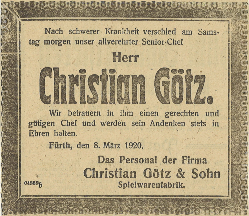 | Beschreibung | Traueranzeige der Belegschaft zum Tode des Firmengründers Christian Götz | ||