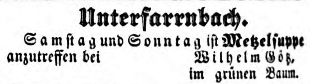 | Beschreibung | Zeitungsanzeige des Wirts im grünen Baum (Unterfarrnbach) Wilhelm Götz, Oktober 1853 | ||