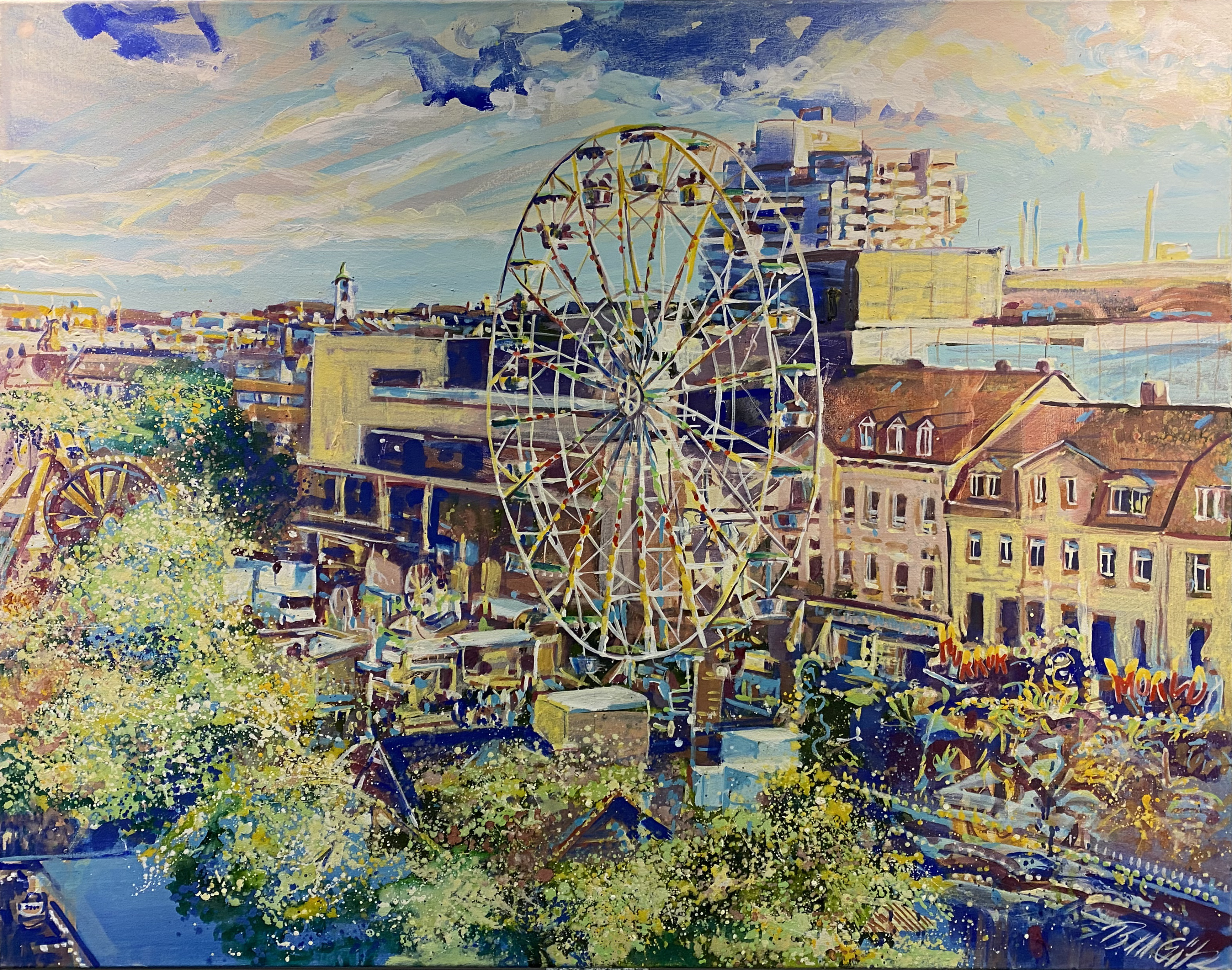 Das Gemälde »Kärwa« von Birgit Maria Götz aus dem Jahr 2021 zeigt den Blick von Nordwesten über die Fürther Freiheit während der Kärwa.