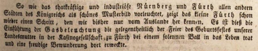 | Beschreibung | Erwähnung der ersten Gasbeleuchtung in Bayern bei der Kasinogesellschaft in Fürth, 1840 | ||