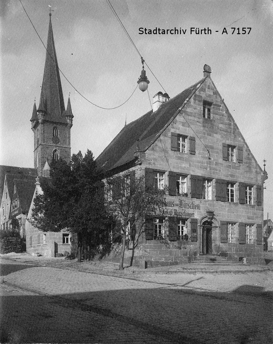 | Dateiinfo (Bild-Unterschrift und Info-Box, automatisch erstellt) | Gasthaus "Zum Hirschen", Burgfarrnbach Nr. 27 (Aufnahme 1908) Lizenz: Bildlizenz-Stadtarchiv | ||