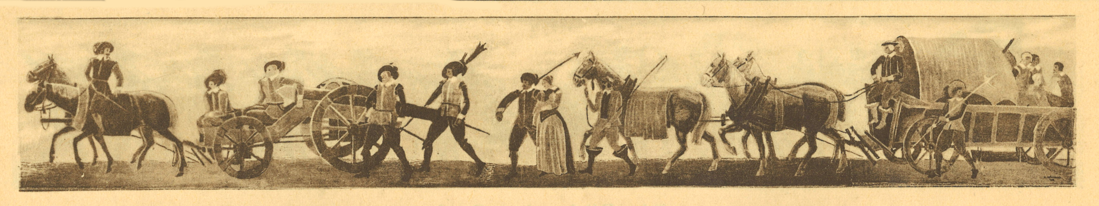 | Beschreibung | Der Grüne Baum im "Schwedenjahr" 1932, Saal, Wandmalerei, Detail "bespannte Kanone mit Begeitmannschaft, Troß und Bagage" | ||