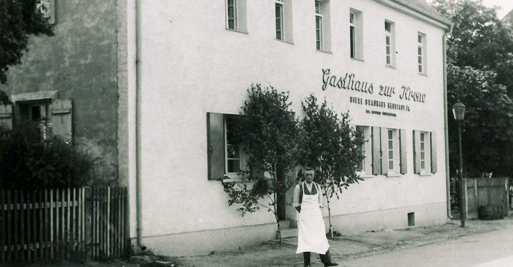| Beschreibung | "Zur Krone" nach der Renovierung, im Vordergrund Leonhard Förderreuther sen. | ||