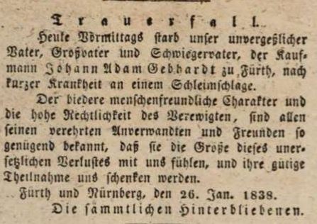 | Dateiinfo (Bild-Unterschrift und Info-Box, automatisch erstellt) | Traueranzeige für Johann Adam Gebhardt, Januar 1838 Lizenz: NoC-NC 1.0 | ||